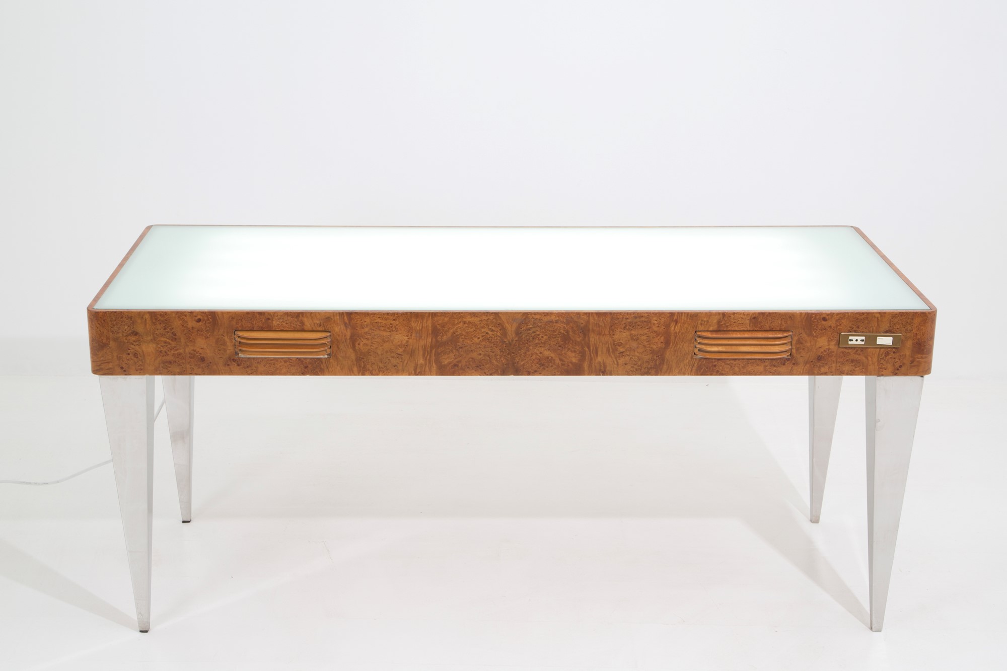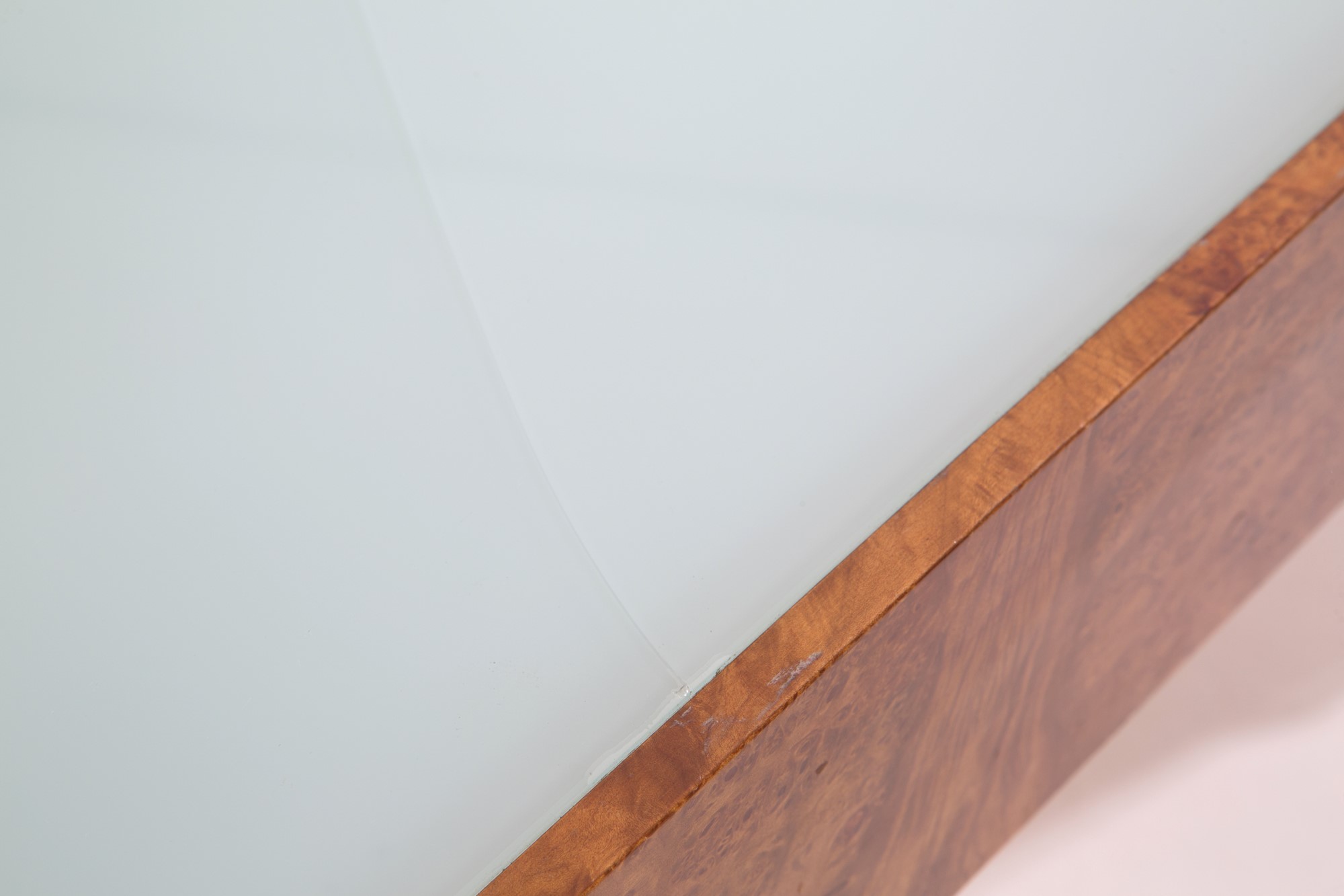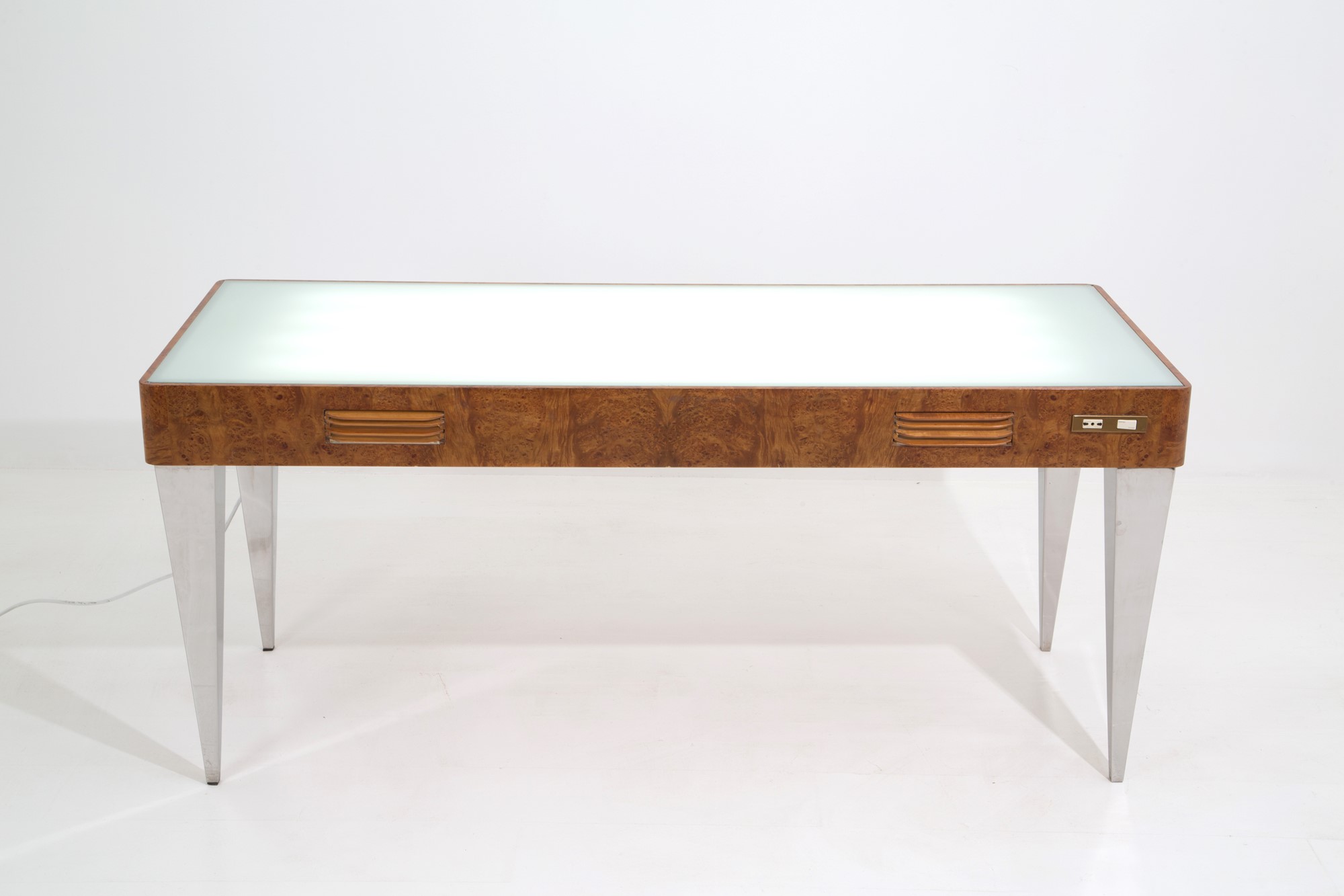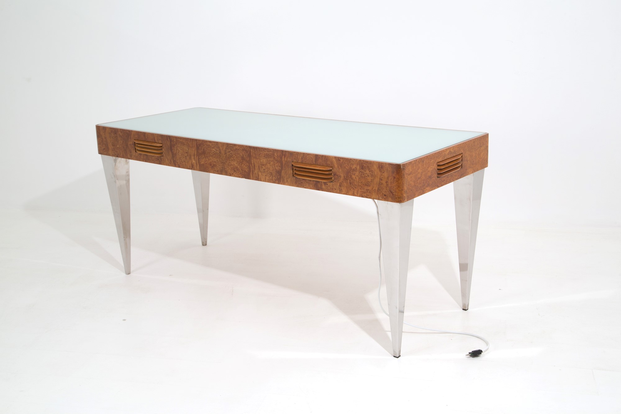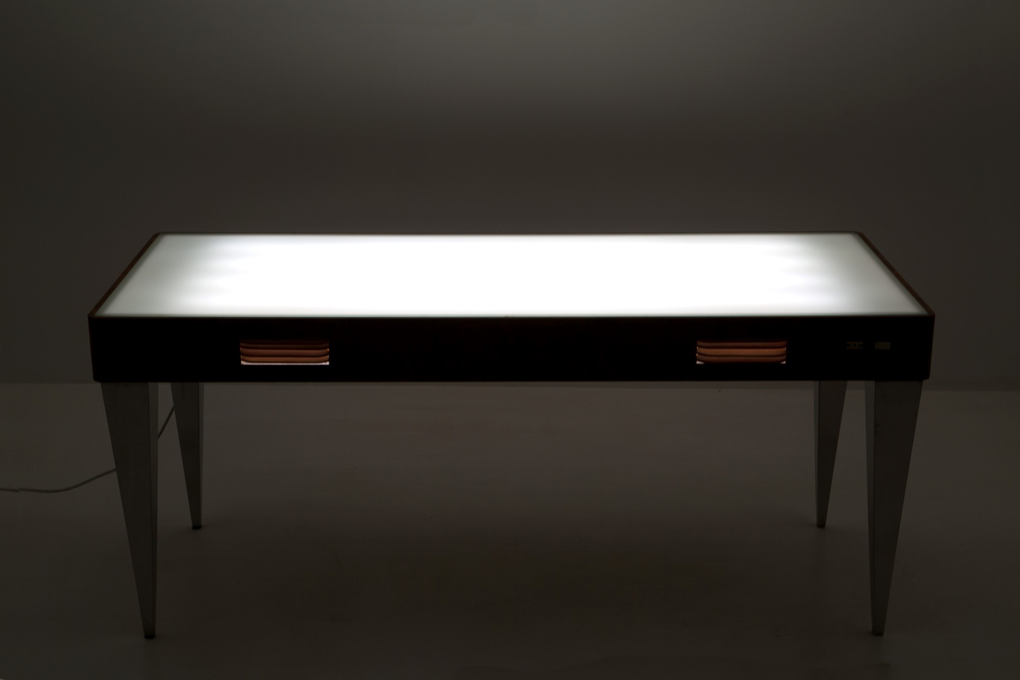 GIANFRANCO LUNETTA (Lecce 1953). “Luci nella notte” table for reading images and slides in wood and briar with side shutter vents for cooling and cold light lamps inside. Mounted on handmade steel feet with white plexiglass and sandblasted glass top. 1981. Unique copy. 80x178x70cm approx. GIANFRANCO LUNETTA (Lecce 1953). Tavolo “Luci nella notte” per lettura immagini e diapositive in legno e radica con sfoghi a persiana laterali per il raffreddamento e lampade a luce fredda all'interno. Montato su piedi in acciaio fatti a mano con piano di appoggio in plexiglass bianco e vetro sabbiato. 1981. Esemplare unico. 80x178x70 cm ca.