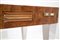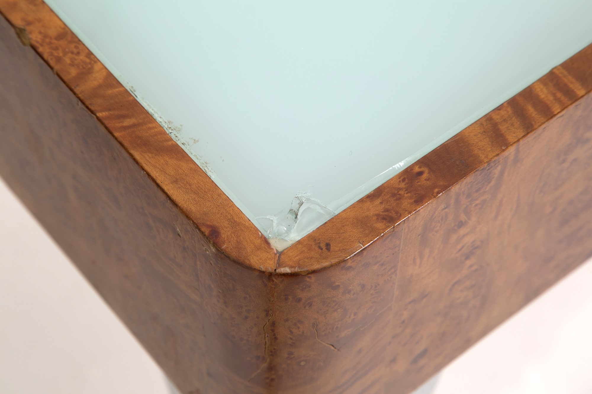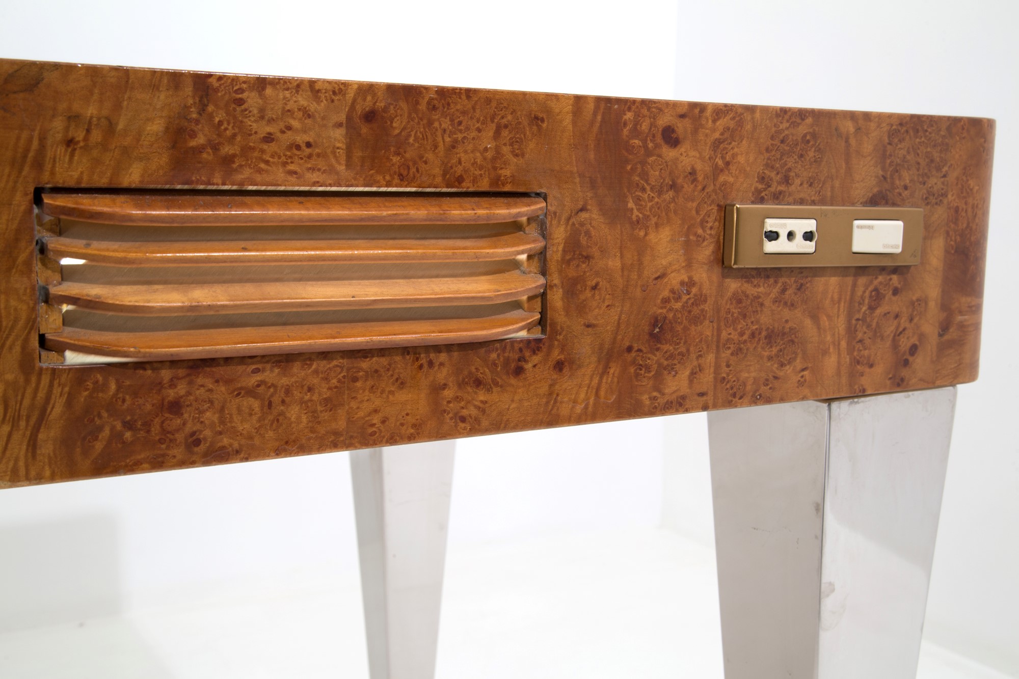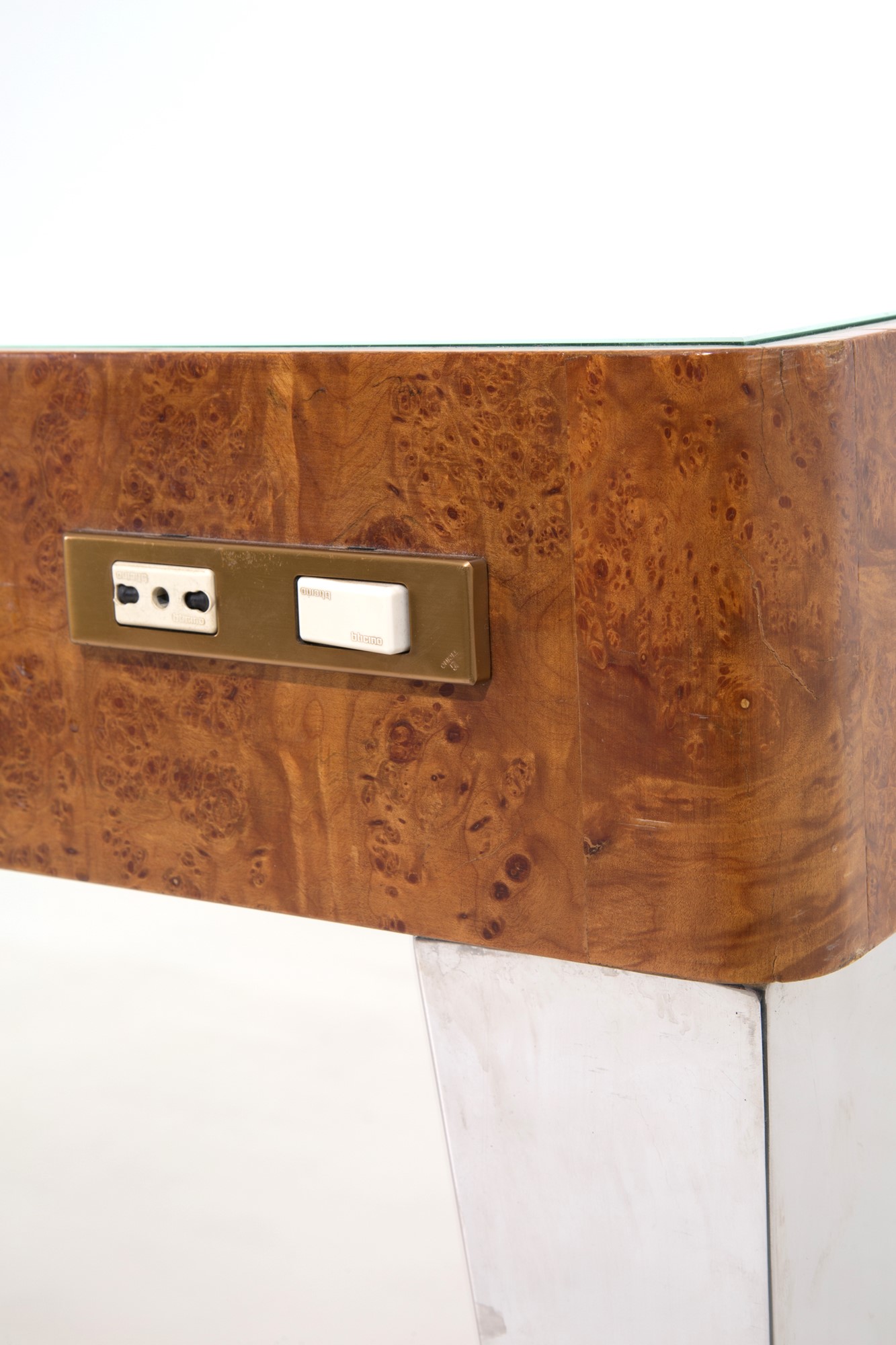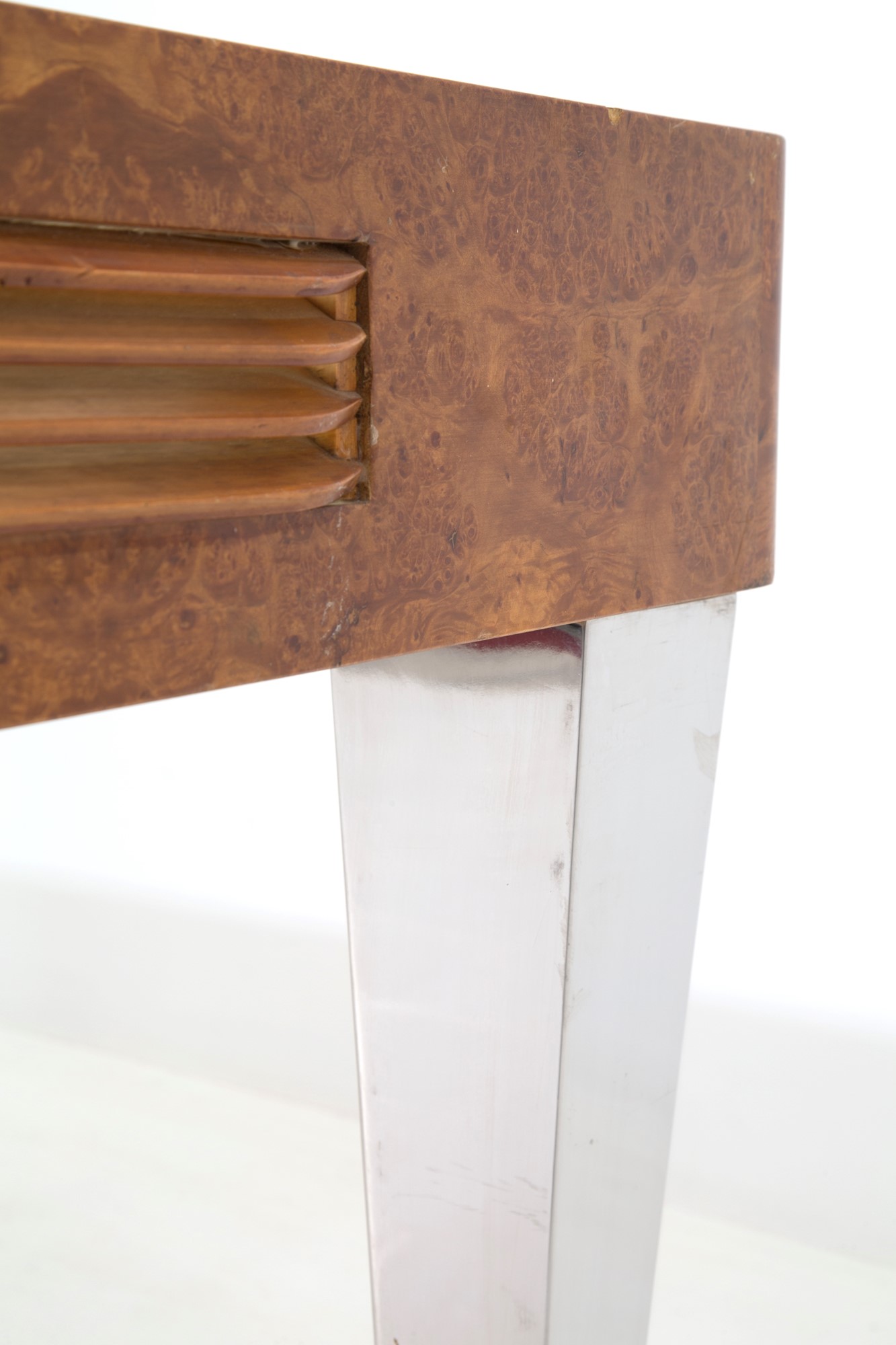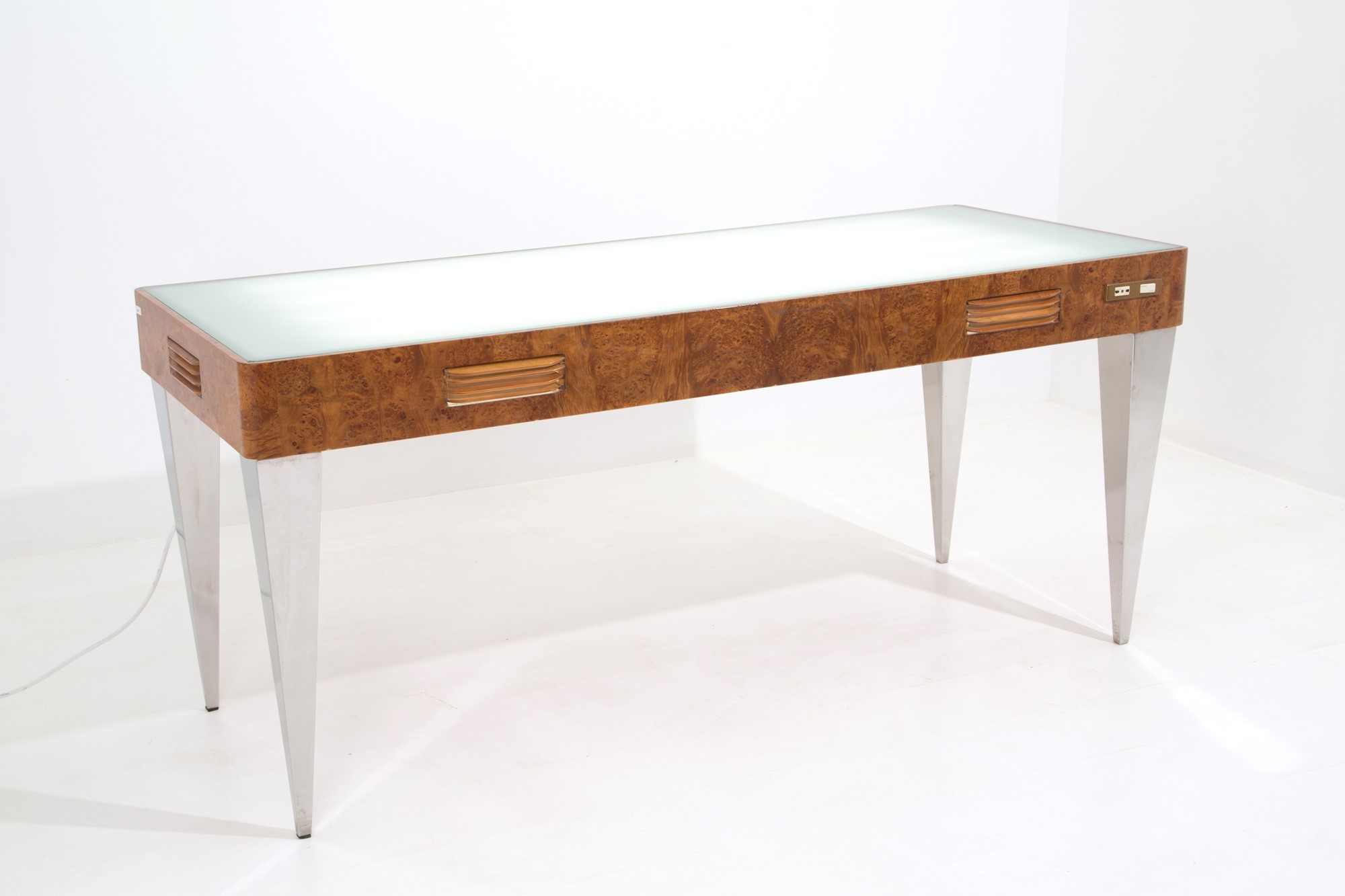 GIANFRANCO LUNETTA (Lecce 1953). “Luci nella notte” table for reading images and slides in wood and briar with side shutter vents for cooling and cold light lamps inside. Mounted on handmade steel feet with white plexiglass and sandblasted glass top. 1981. Unique copy. 80x178x70cm approx. GIANFRANCO LUNETTA (Lecce 1953). Tavolo “Luci nella notte” per lettura immagini e diapositive in legno e radica con sfoghi a persiana laterali per il raffreddamento e lampade a luce fredda all'interno. Montato su piedi in acciaio fatti a mano con piano di appoggio in plexiglass bianco e vetro sabbiato. 1981. Esemplare unico. 80x178x70 cm ca.