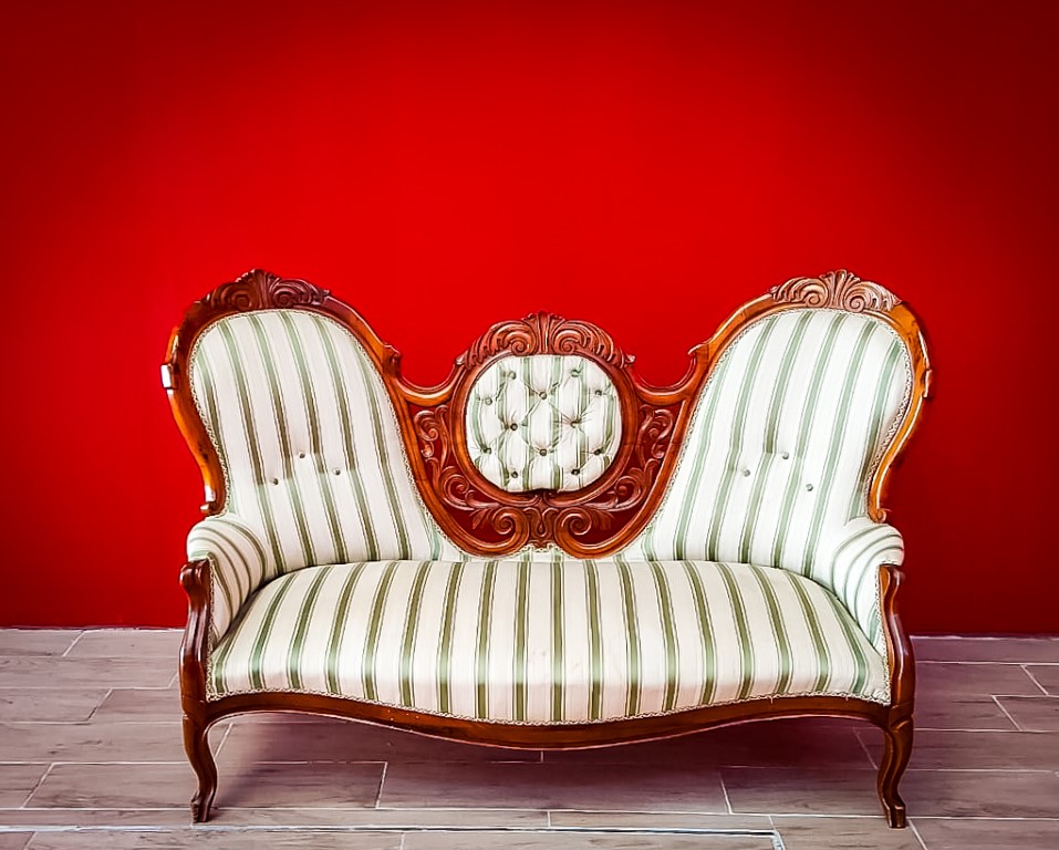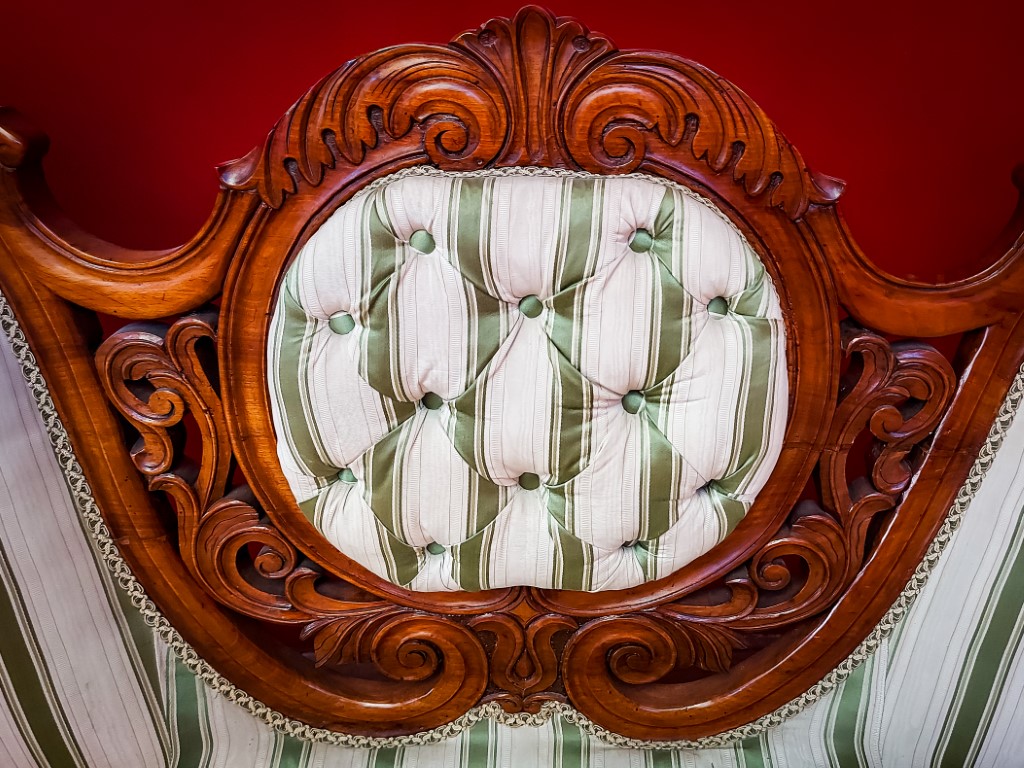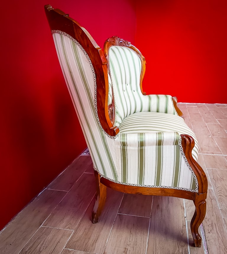 schienale ad onda centrato da intarsio, imbottito e rivestito in tessuto rigato verde salvia e avorio, parte centrale capitonnè, gambe mosse