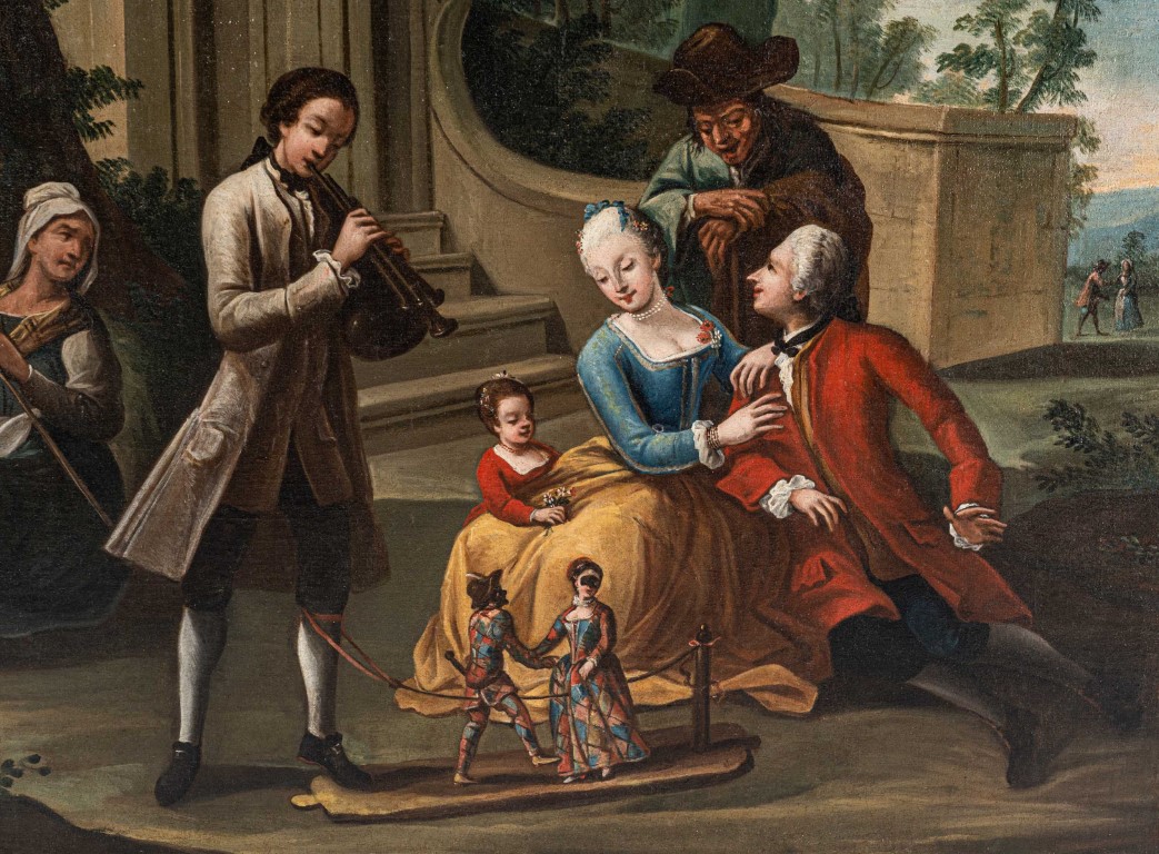 L'opera raffigura una curiosa scena con nobili e nobildonne vestiti a festa che assistono ad uno spettacolo di burattini dai costumi arlecchineschi, chiaro rimando alla produzione di Giovanni Domenico Ferretti, uno dei piu' importanti pittori del Rococò toscano noto per le sue tele di genere teatrale con protagonista il personaggio della commedia dell'arte Arlecchino.