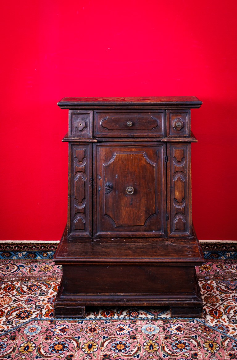 piano rettangolare a becco di civetta, tre cassetti sotto al piano e sportello decorati a formelle sagomate, pianetto inginocchiatoio da alzarsi