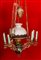 struttura in metallo, corpo centrale in ceramica smaltata verde scuro con decorazioni a rilievo, paraluce a goccia in vetro tornito e satinato, paraluce a cupola in vetro lattimo bianco, tre bracci con nove luci, con candele a torciglione in vetro lattimo celeste