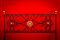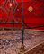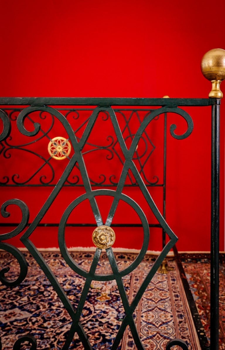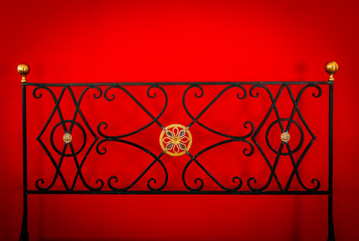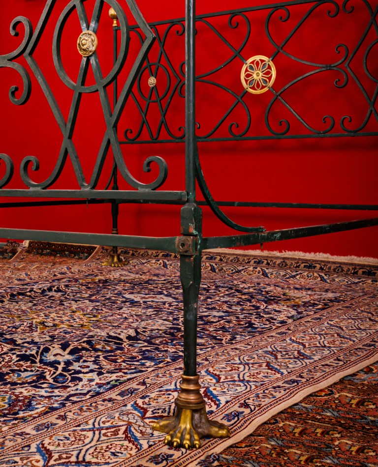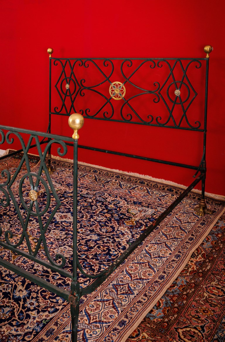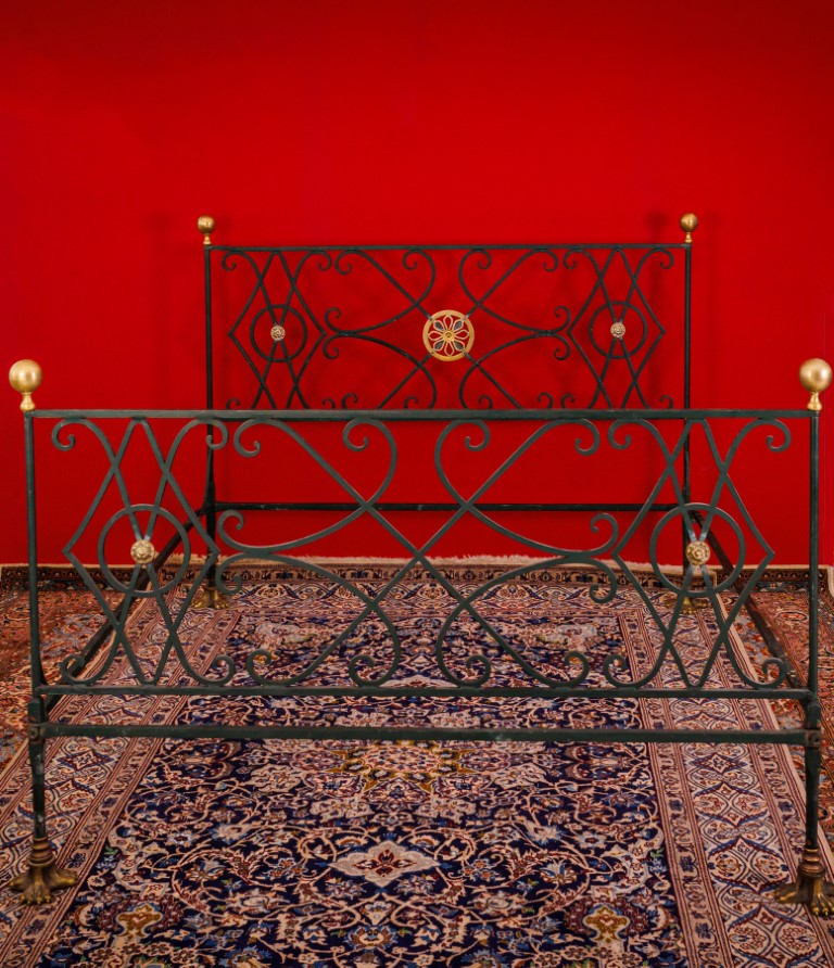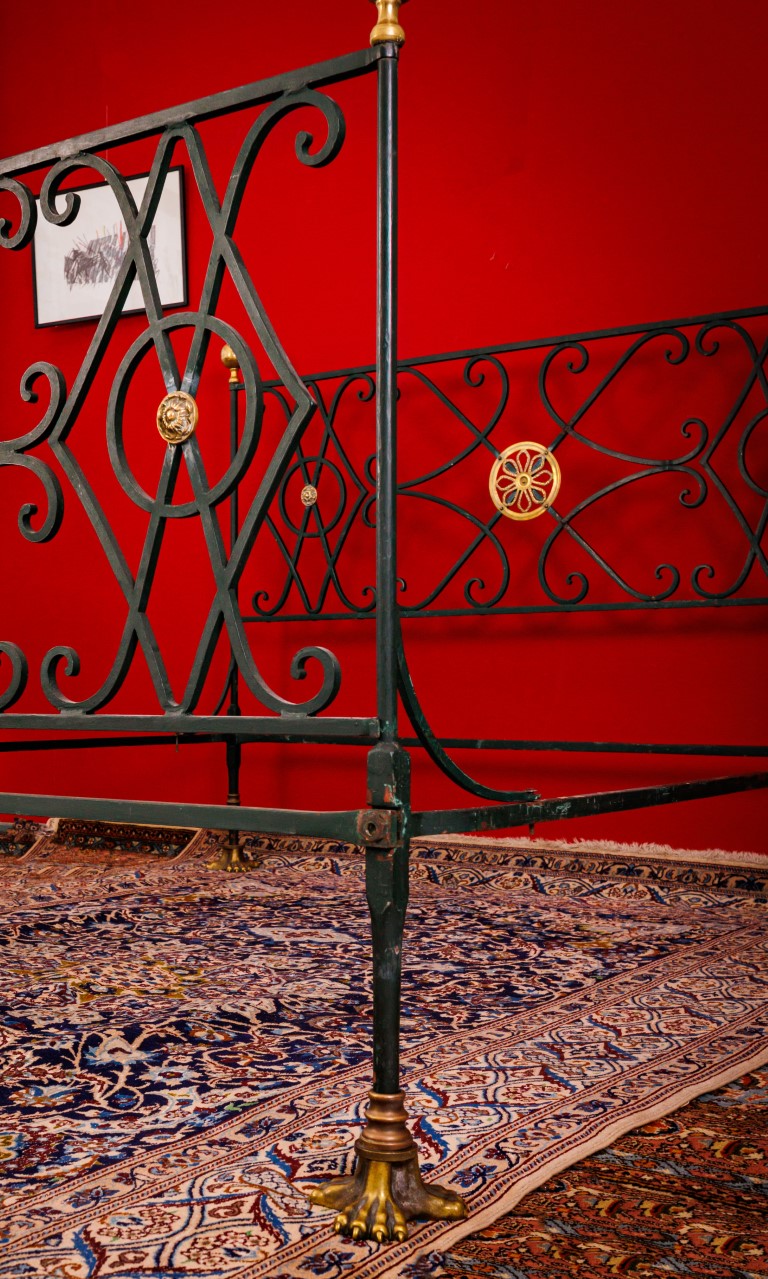 dipinto di verde, testiera e pediera a motivi geometrici intersecantisi con finali sferici in ottone, zampe ferine