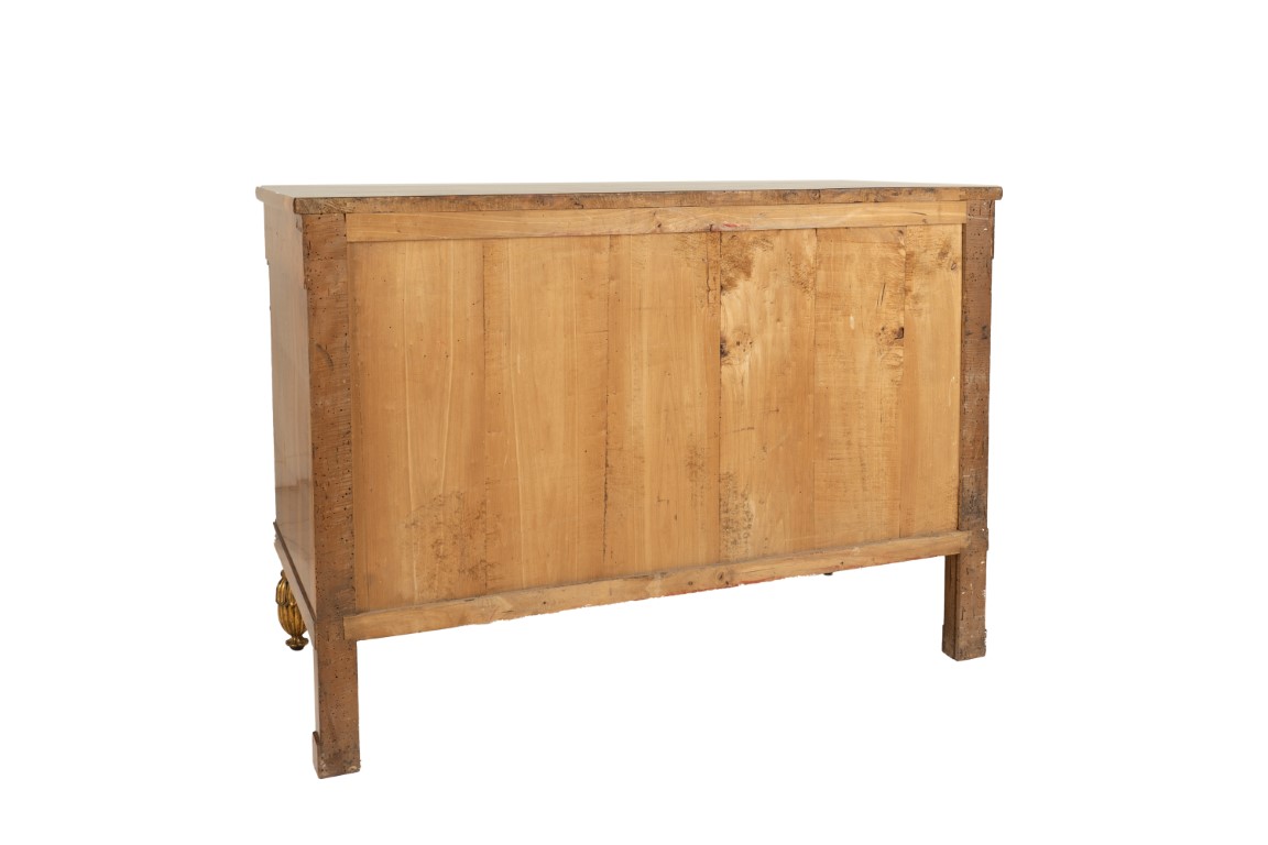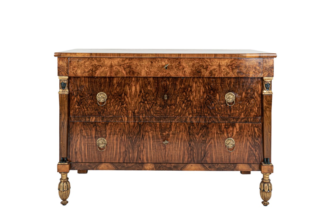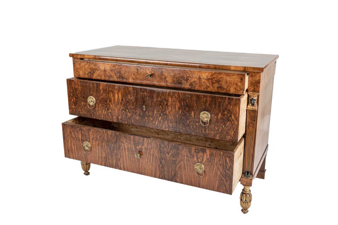 Cassettone in ciliegio e radica di olivo intagliati ed in parte ebanizzati e dorati