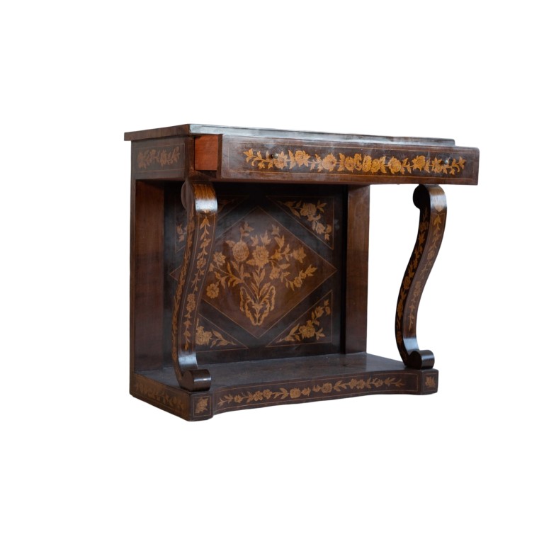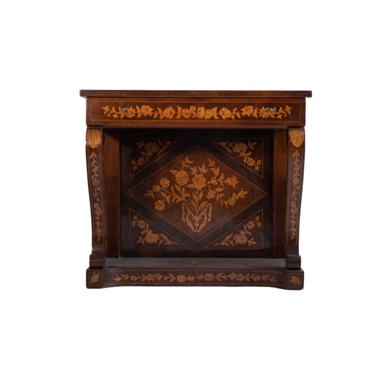 riccamente intarsiato a motivi floreali, piano rettangolare, un cassetto nella fascia, sostegni anteriori a mensolone, sottopiano sagomato
