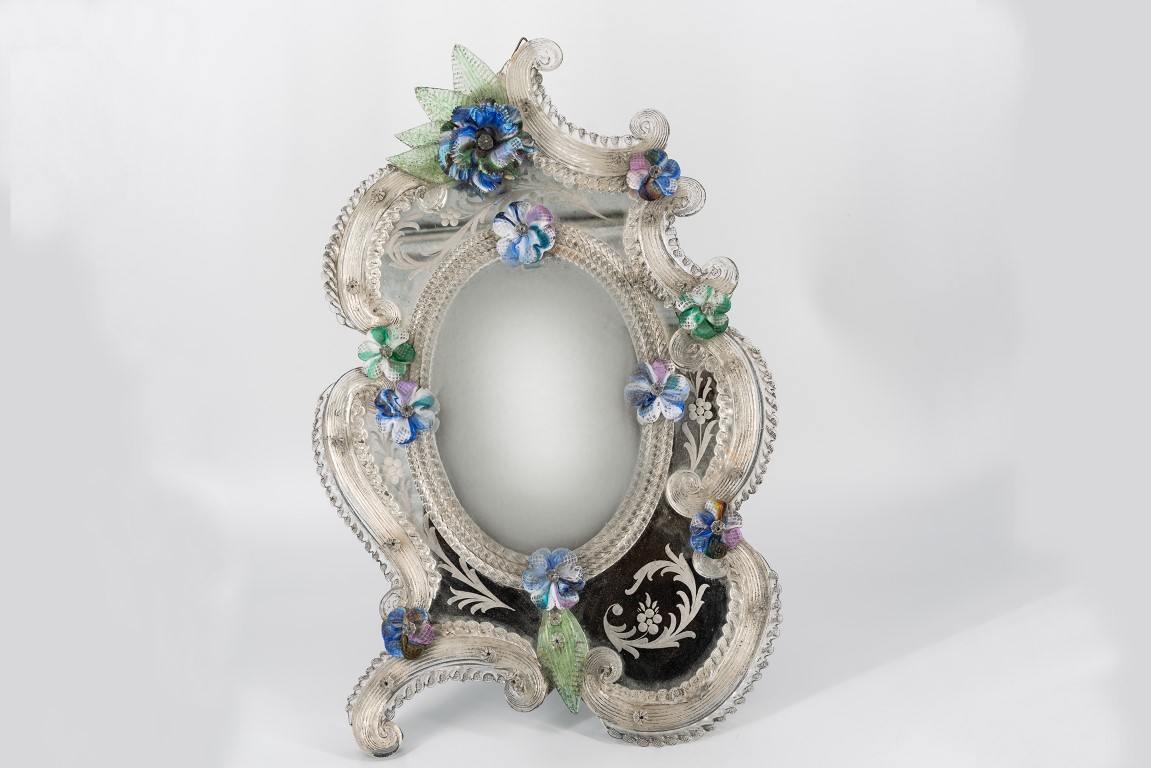 di forma sagomata, in vetro incolore decorato alla mola con applicazioni di fiori in vetro policromo