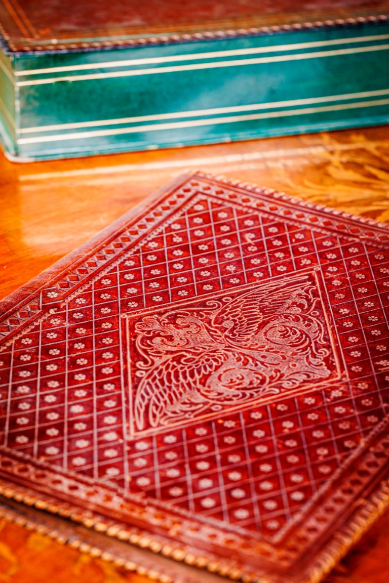 due sottomano, portaposta in pelle martellata e una scatola in marocchino verde