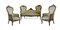corredato da coppia di poltrone en pendant, imbottito e rivestito in tessuto damascato di colore verde