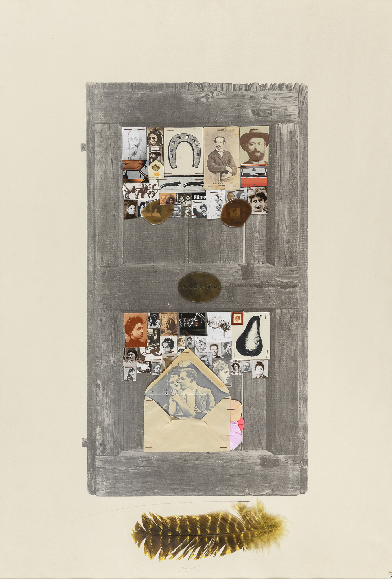 Collage, targhetta metallica e penna su fotolitografia, cm. 100 x 70
