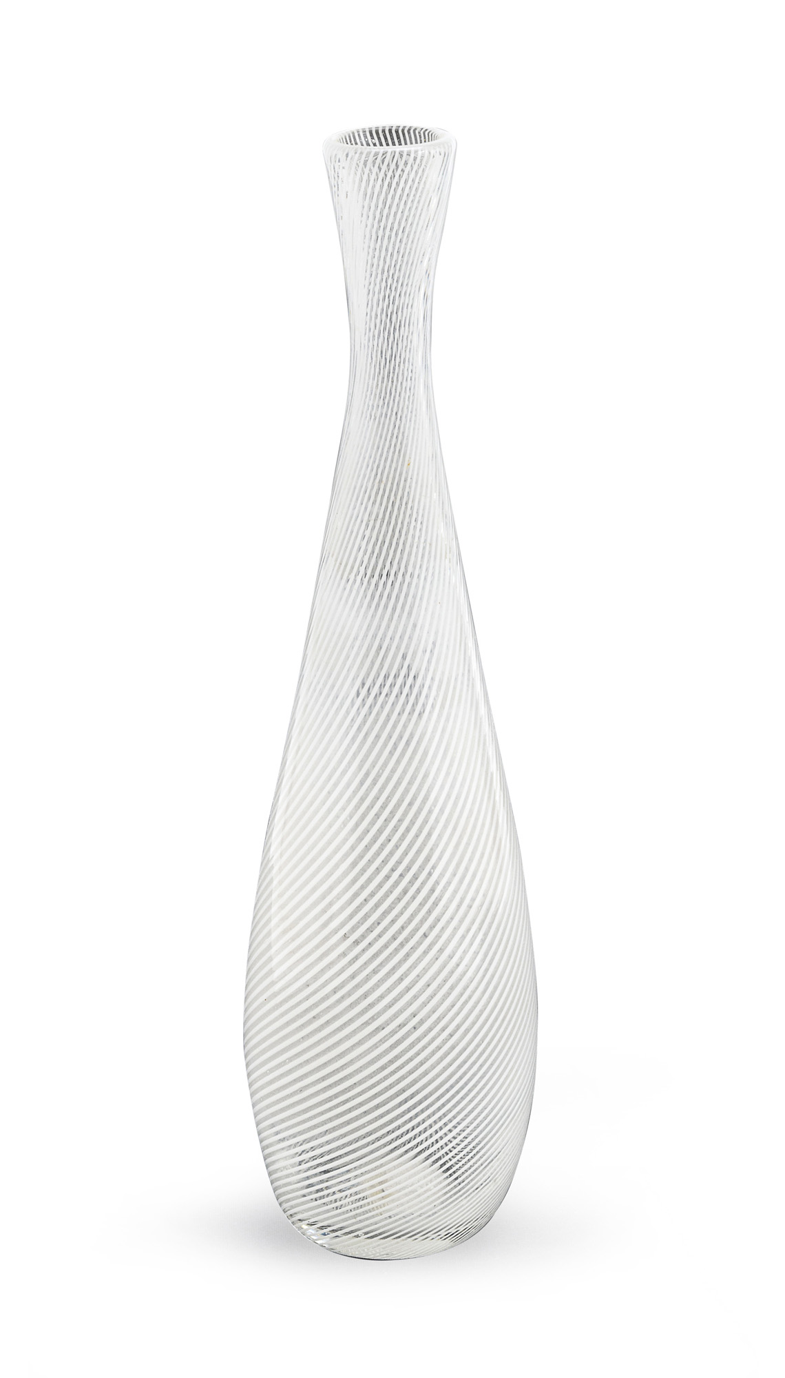 in vetro soffiato trasparente con spirali in filigrana bianche con forma allungata.