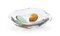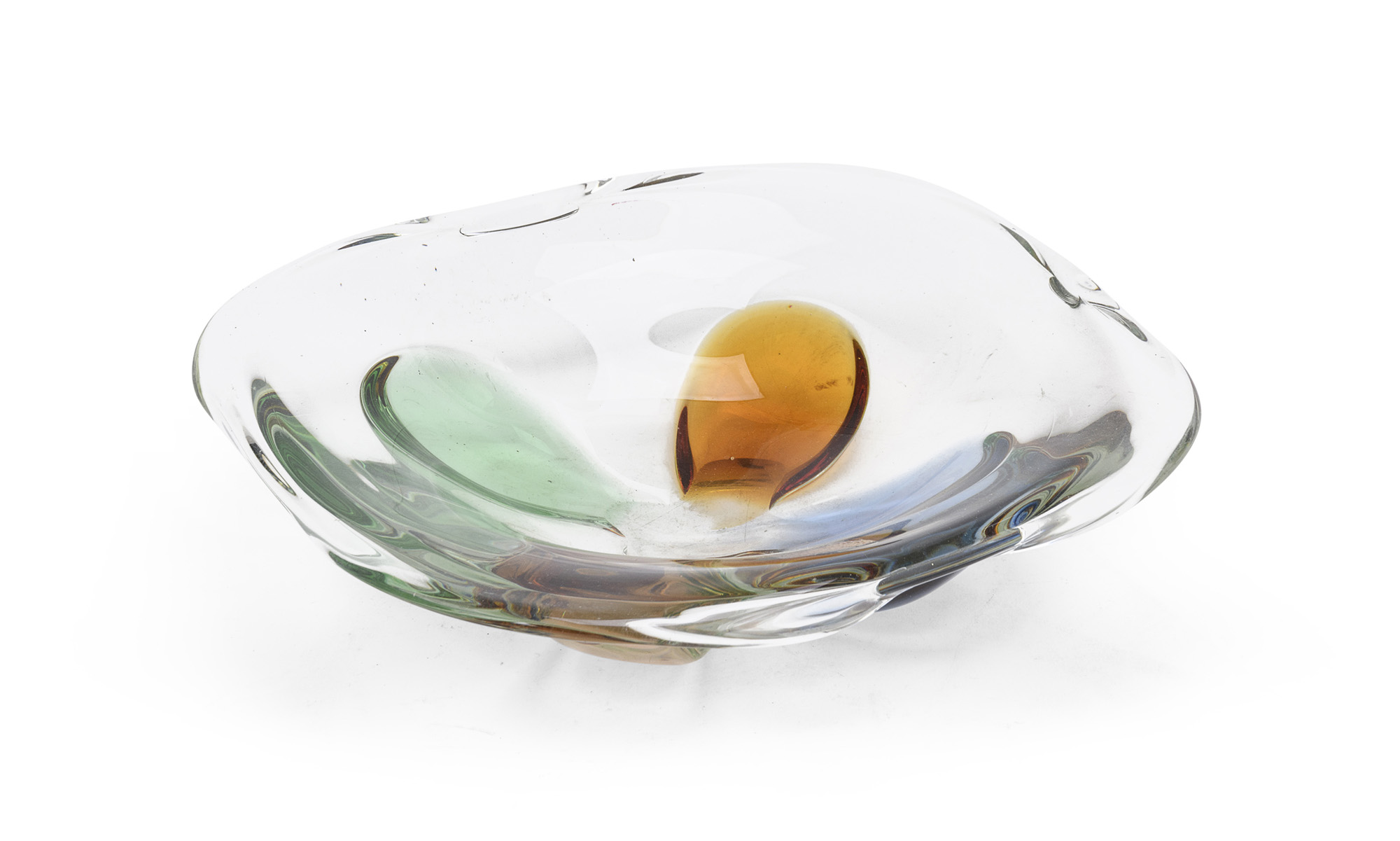 in vetro massello, con decoro a petalo alla base nei colori dell'arancio, verde e blu.