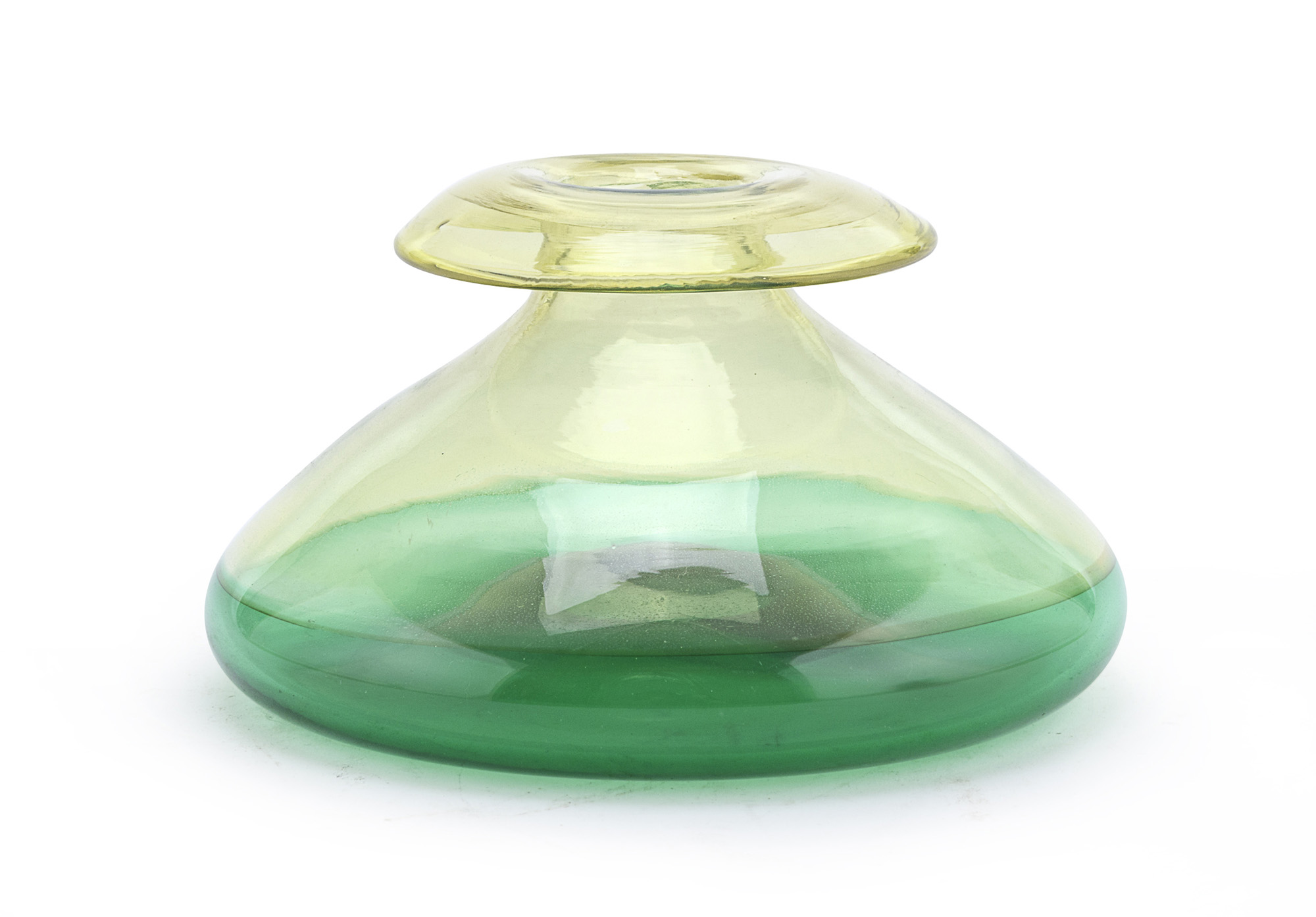 a fondo giallo e verde trasparente con corpo a fiasca e bordo aggettante.