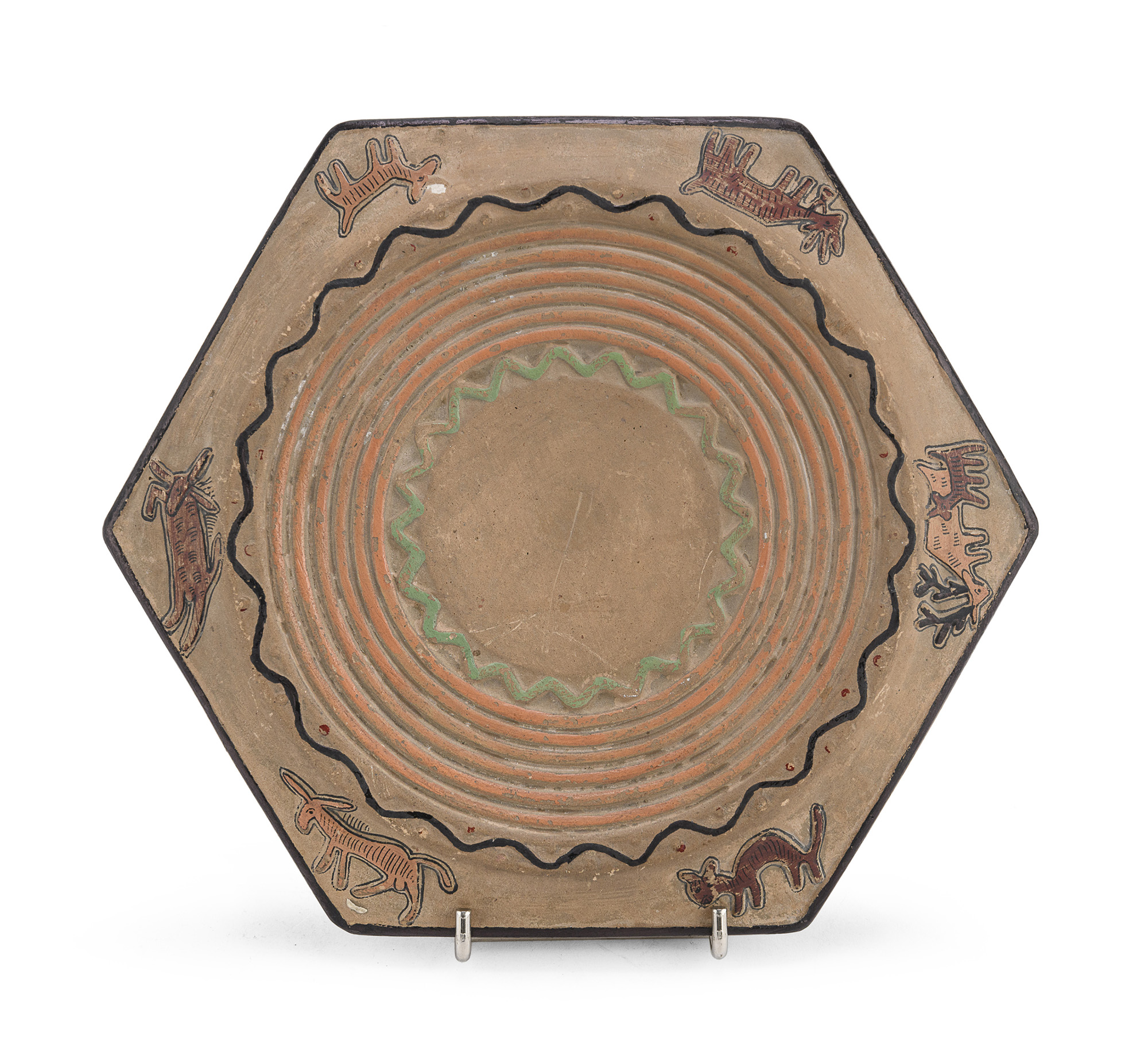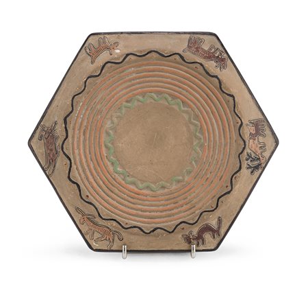 in terracotta con colori a freddo e decoro ad animali e motivi geometrici.