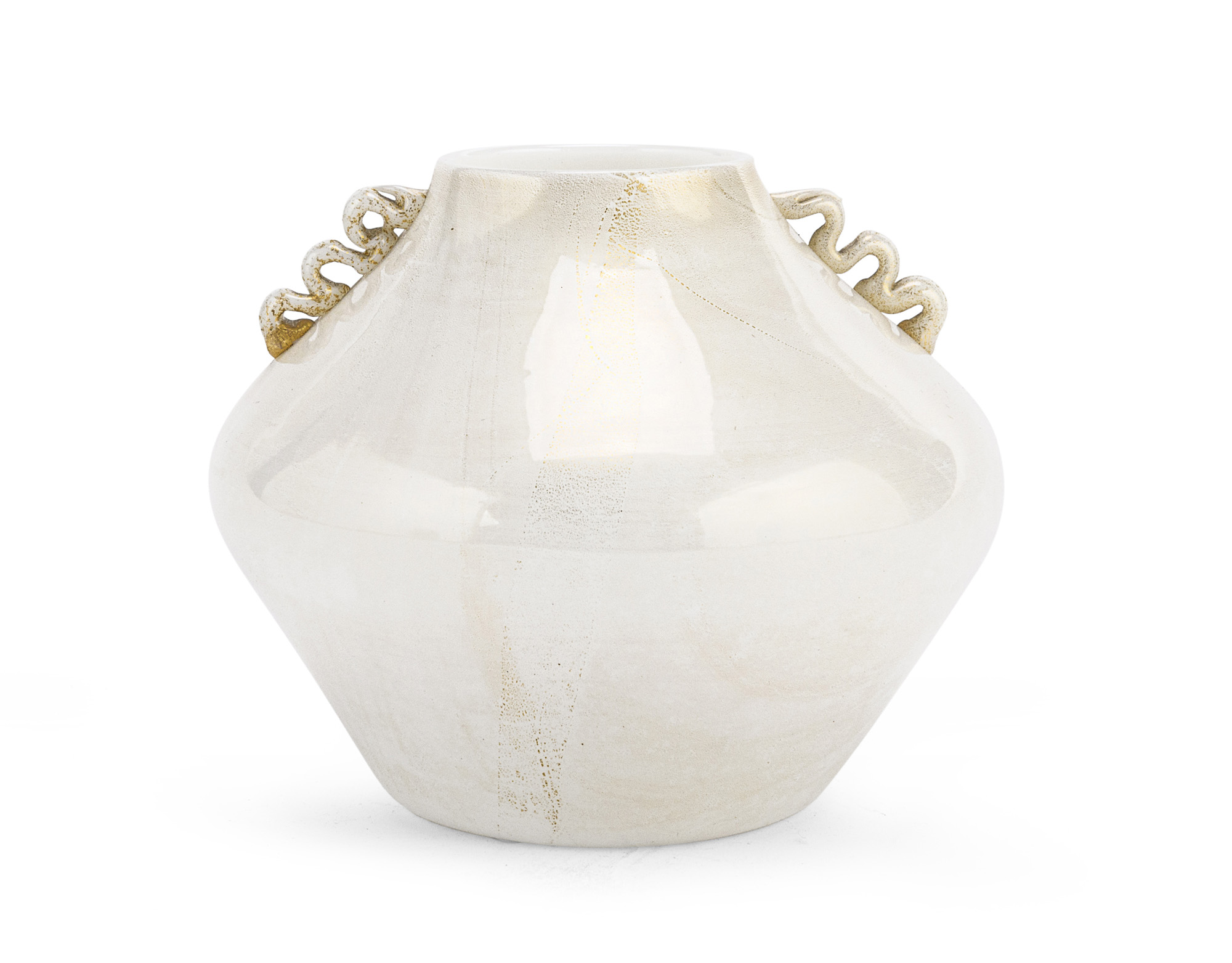 a corpo circolare schiacciato, a fondo bianco lattimo con avventurina, anse in pasta di vetro applicate.