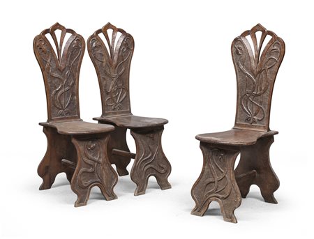 con schienali scolpiti ad intreccio di campanule e traforo a palmetta. Piedi a mensola anch'essi scolpiti.
