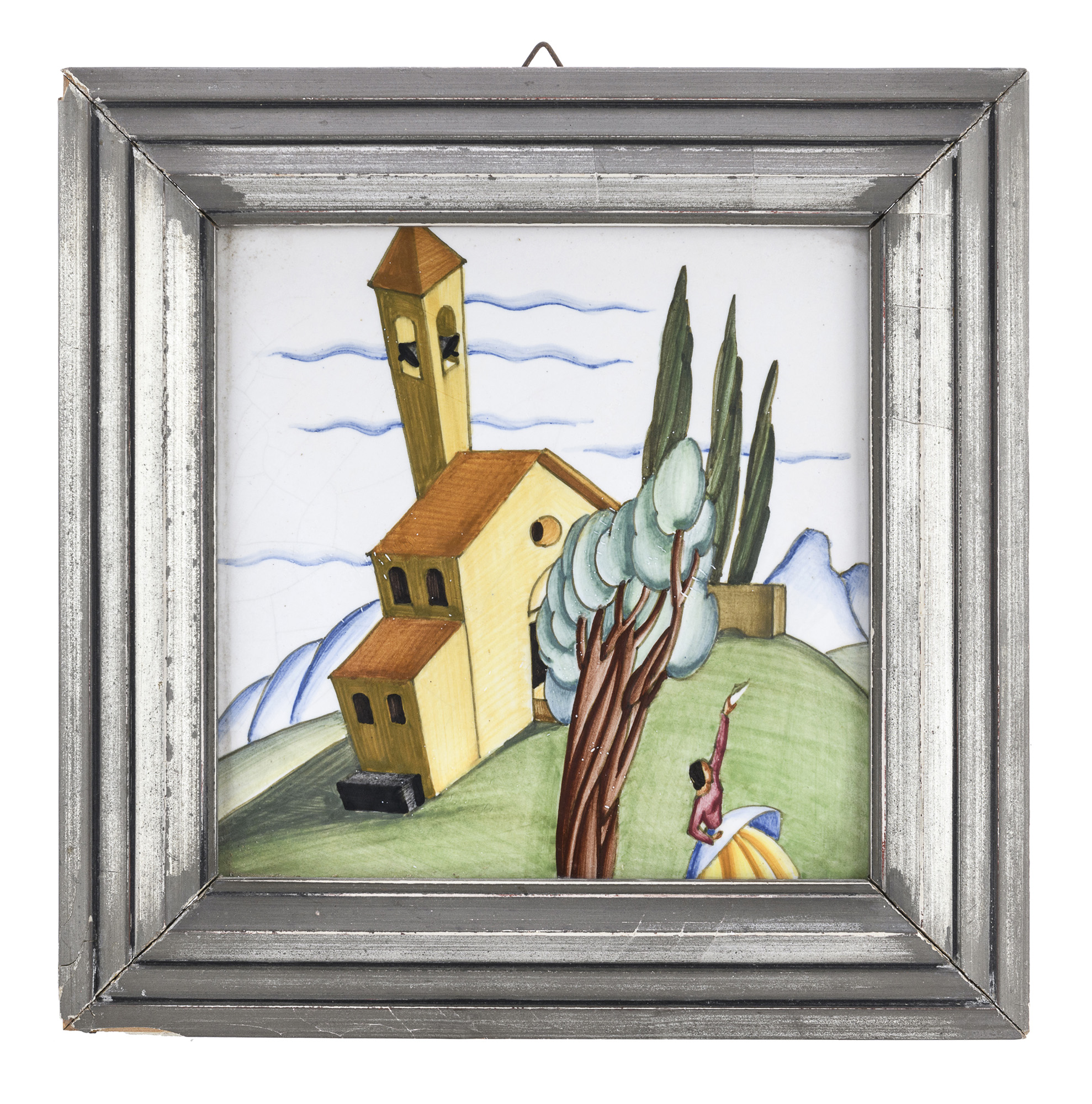 dipinta a mano, raffigurante donnina e chiesa di campagna.