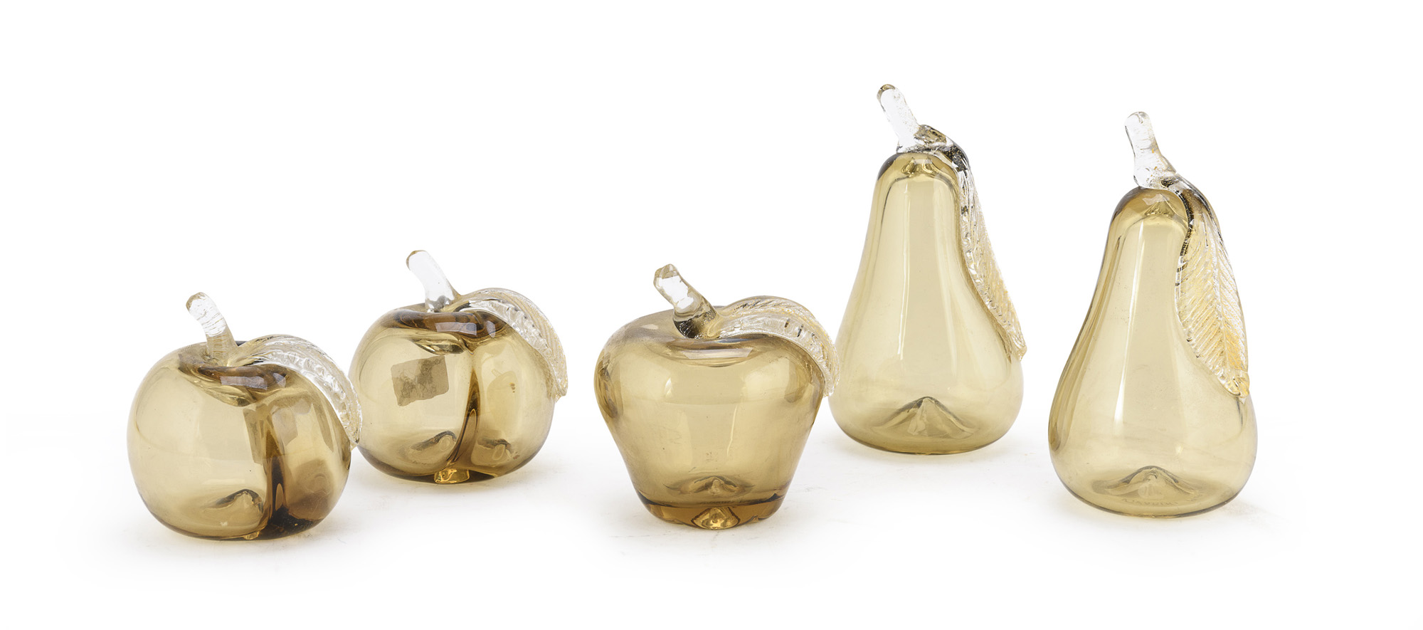 a sagoma di pere e di mele in vetro soffiato con inclusioni in avventurina.