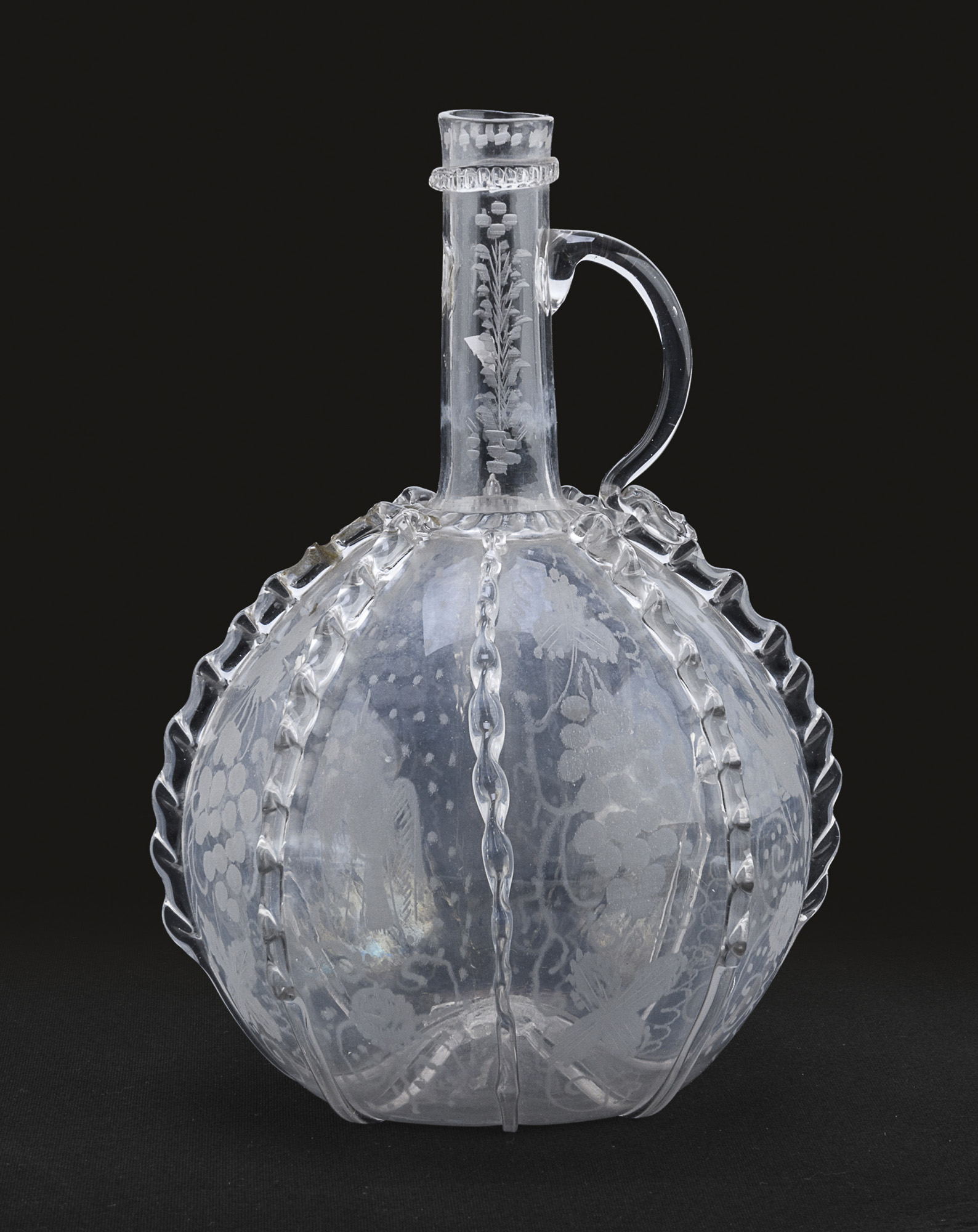 a fondo trasparente con decoro inciso ad uccelli e grappoli d'uva e bordi a pinna di serpente.