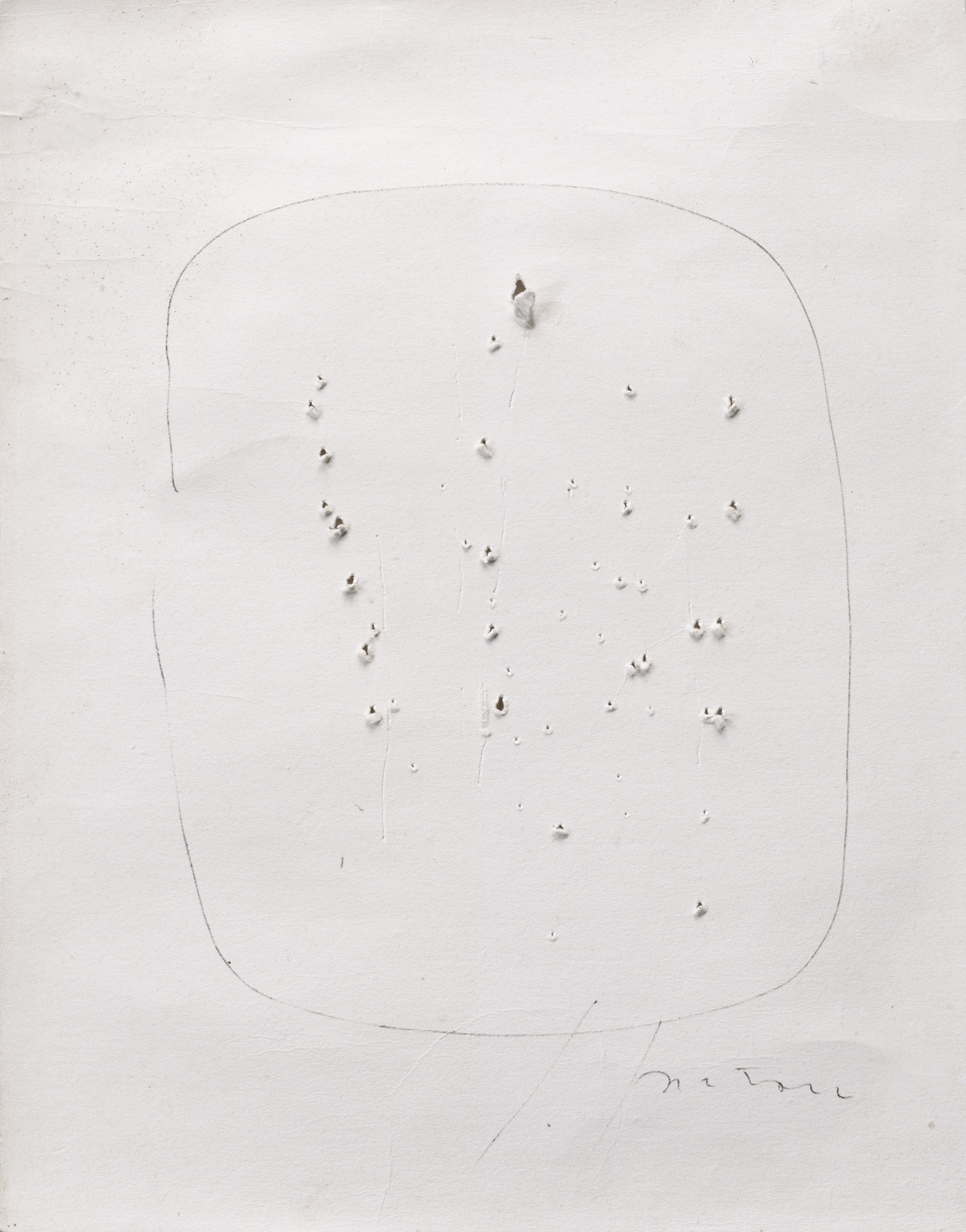 LUCIO FONTANA 1899 - 1968 CONCETTO SPAZIALE signed, ballpoint pen, holes, tears and graffiti on paper firmato biro, buchi, strappi e graffiti su carta assorbente bianca cm 36,5x28,5 Opera registrata presso la Fondazione Lucio Fontana, Milano, con il n. 793/9 L'opera è accompagnata da certificato su fotografia rilasciato dalla Fondazione Lucio Fontana, Milano PROVENANCE Collezione Privata, Milano Ivi acquistato dall'attuale proprietario negli anni Novanta
