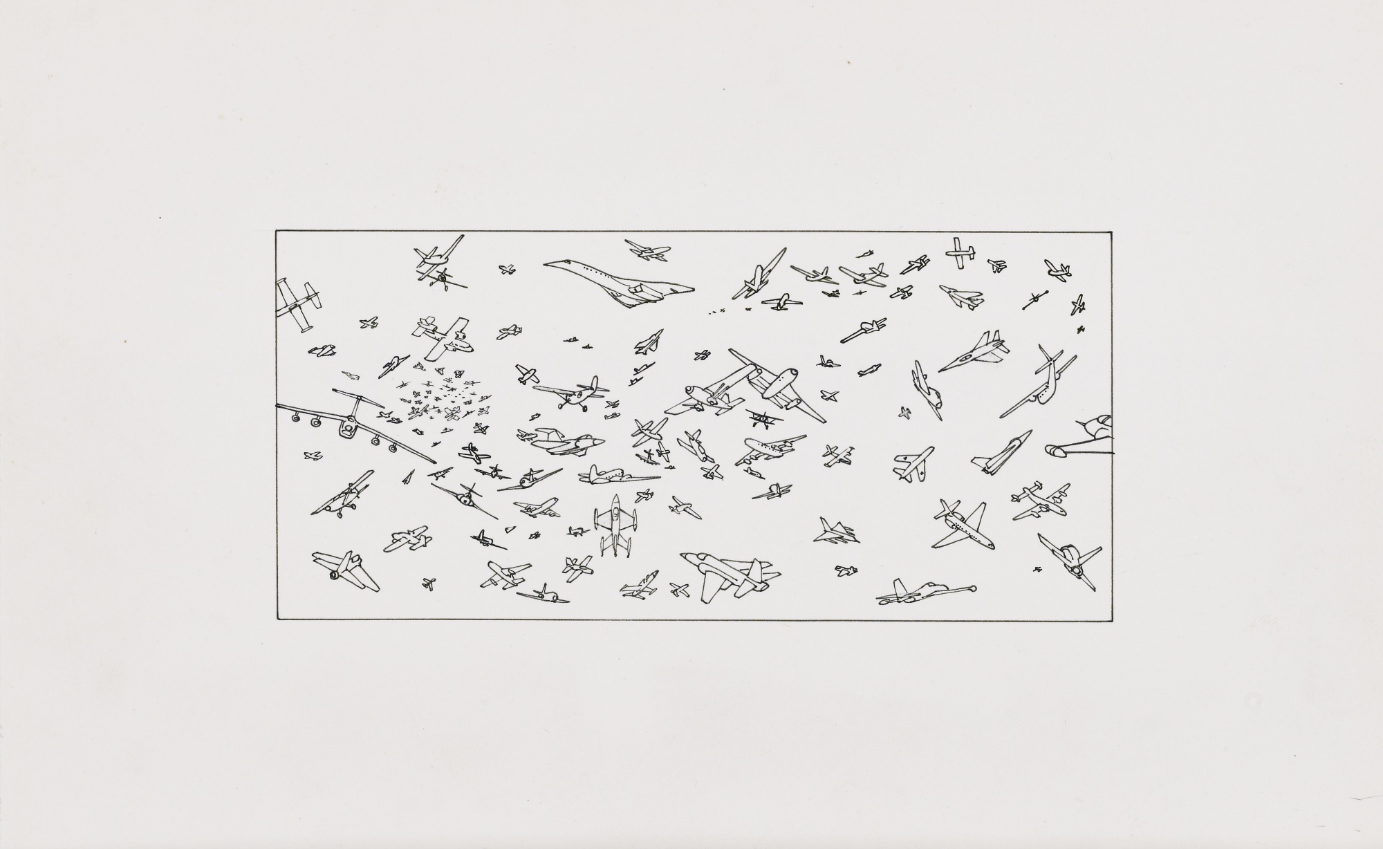 ALIGHIERO BOETTI 1940 - 1994 AEREI (STUDIO) ink on paper. Executed in 1977 china su carta cm 16,5x24,8 (foglio) Eseguito nel 1977 Opera registrata presso l'Archivio Alighiero Boetti, Roma, con il n. 2024 L'opera è accompagnata da certificato su fotografia rilasciato dall'Archivio Alighiero Boetti, Roma PROVENANCE Galleria Salvatore + Caroline Ala, Milano Ivi acquistato dall'attuale proprietario EXHIBITED Basilea, Kunsthalle, Alighiero Boetti, 1978, n. 53 New York, Galleria Salvatore Ala, Alighiero e Boetti, 1980 New York, Galleria Salavatore Ala, Alighiero e Boetti, 1990 LITERATURE J.C. Amman, Alighiero Boetti. Catalogo generale. Tomo secondo, Milano 2012, pag. 254, n. 863, illustrato