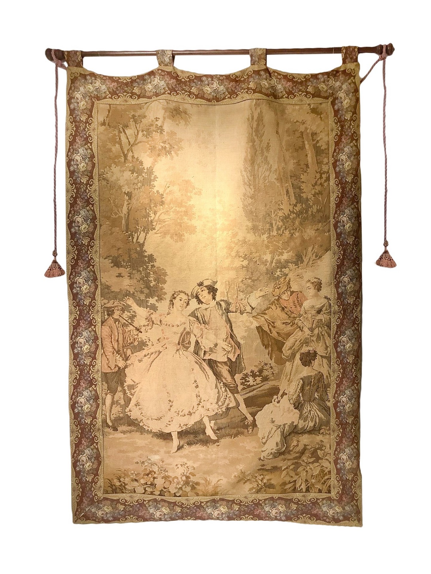 Arazzo riportante scena di genere, fine XIX secolo H 200 cm x 125 cm Emulsione Con cornice ricamata in policromia a motivo floreale. Francia.