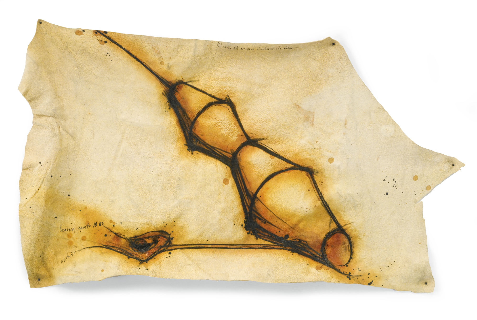 GILBERTO ZORIO N. 1944 NEL VENTRE DEL COMPASSO IL VULCANO È LA COLONNA signed, titled and dated agosto 1983, ink on buckskin firmato, intitolato e datato agosto 1983 inchiostro su pelle di daino cm 69x40 L'opera è accompagnata da certificato su fotografia rilasciato dall'artista PROVENANCE Studio La Torre, Pistoia Collezione Privata, Brescia Ivi acquistato dall'attuale proprietario EXHIBITED Siracusa, Centro d'Arte Contemporanea, Nel ventre del compasso il vulcano è la colonna, 1983