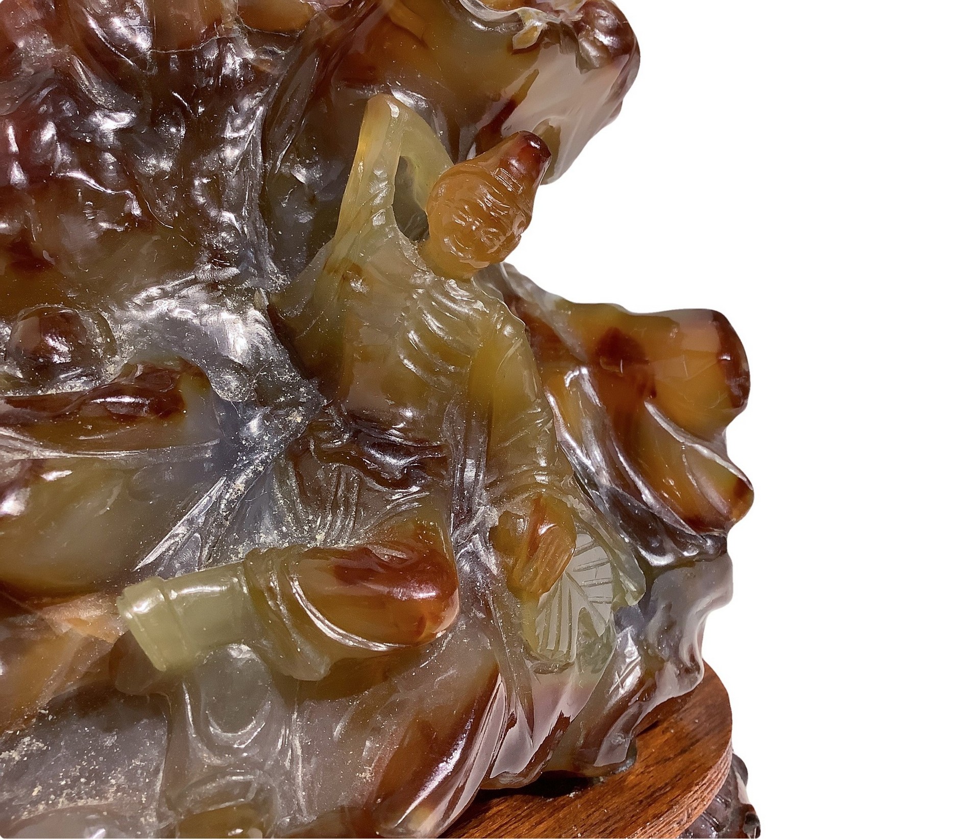 Scultura in corniola con figura nella parte centrale h 18 cm, b 15 cm Base in legnoBase in legno