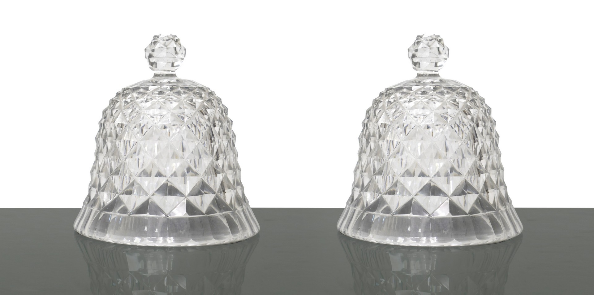 Coppia di campanule in cristallo, XX secolo h cm 20, diametro cm 19 Piccole sbeccaturePiccole sbeccature