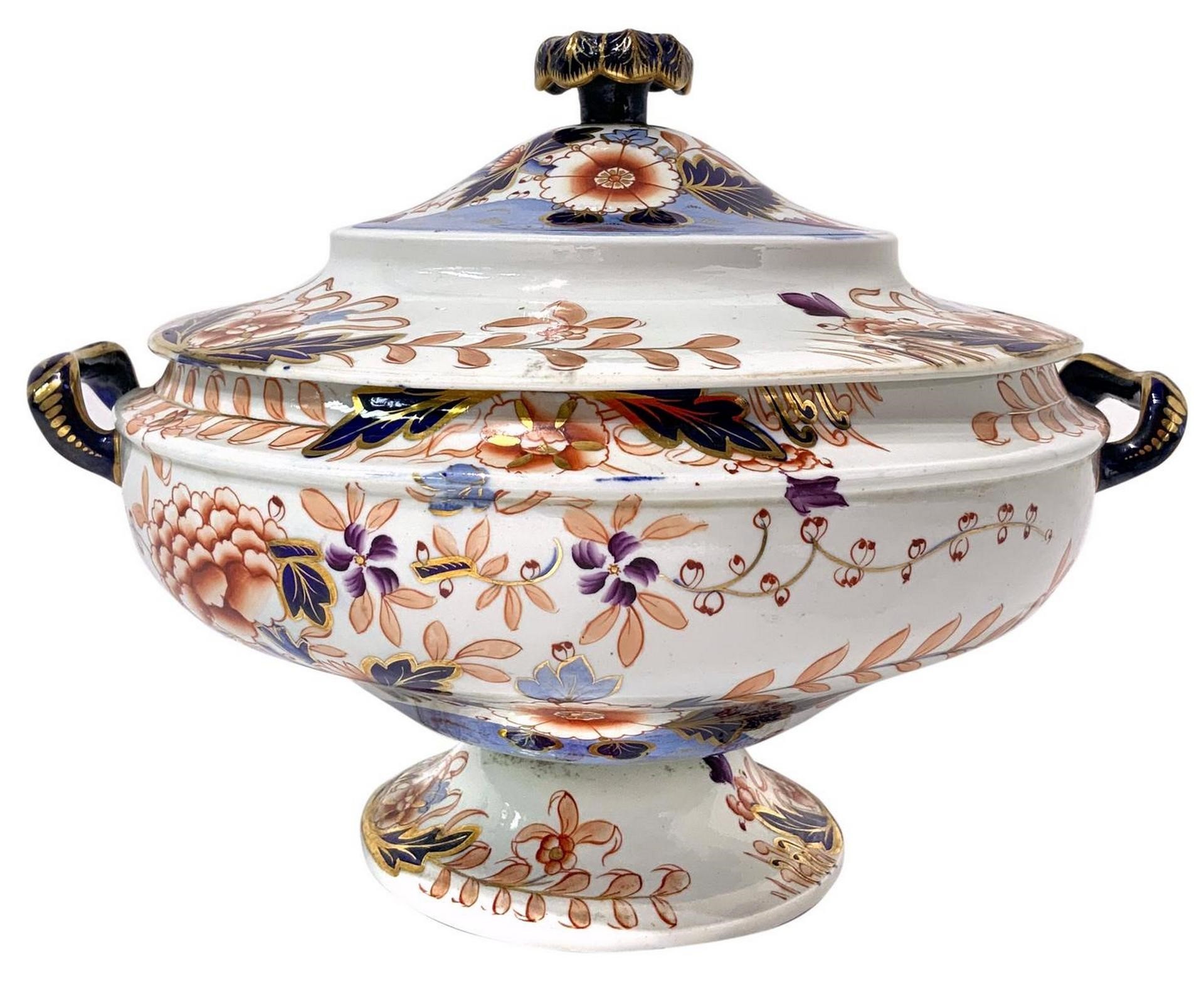 Davenport Longport Imari China - Prestigioso servizio di piatti in porcellana con motivi floreali , XVIII secolo porcellana Composto da 18 piatti piani, 9 piatti fondi, 2 piatti da portata ovali cm 36, 1 piatto da portata grande ovale cm 50, 1 piatto rotondo da portata cm 36, 1 piatto rotondo cm 35, 1 piatto rotondo cm 31, 2 piatti ovali cm 411 zuppiera, 1 salsiera, 1 insalatiera, 2 mestoli. Provenienza importante casa nobiliare siciliana.