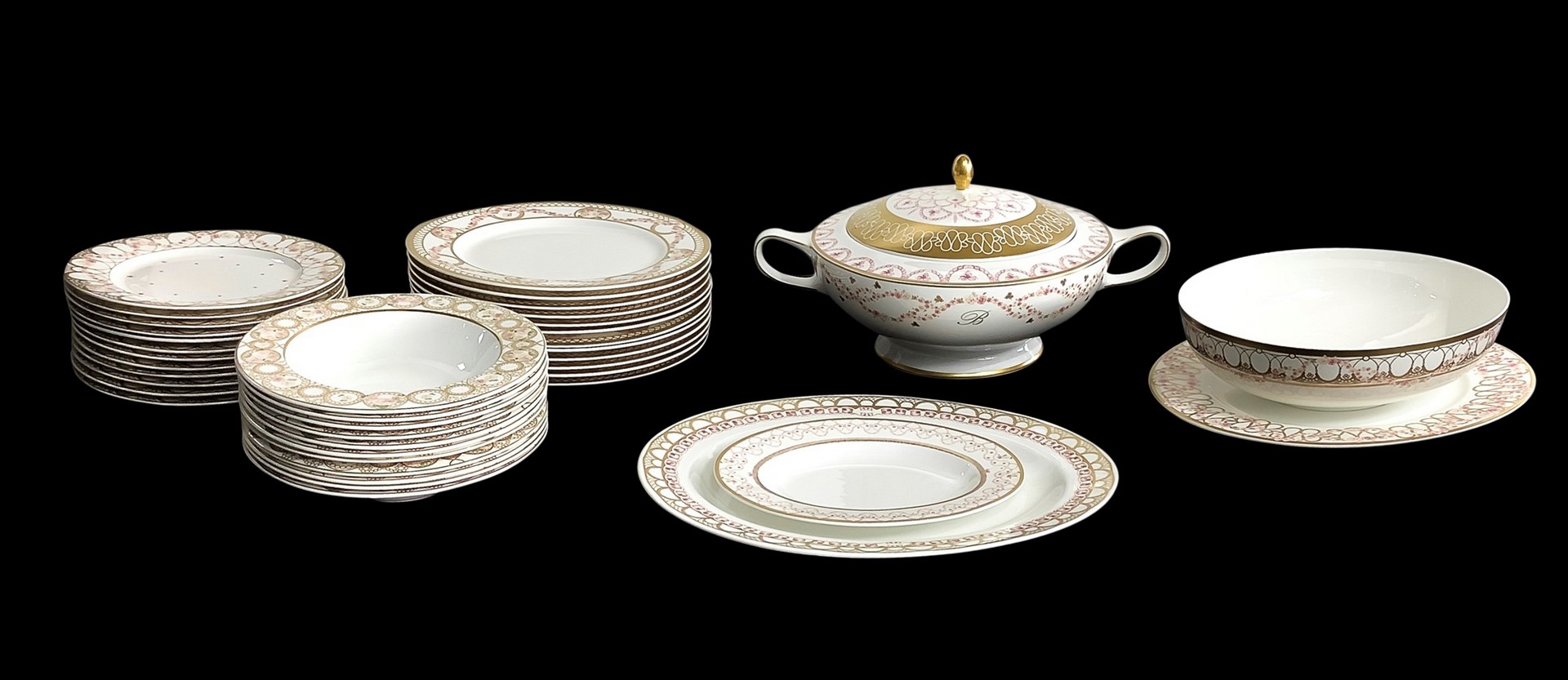 Servizio composto da: 12 piatti piani, 12 piatti frutta, 12 piatti fondi, 1 piatto ovale grande, 1 zuppiera, 1 insalatiera, 1 piatto ovale piccolo, 1 piatto tondo da portata.