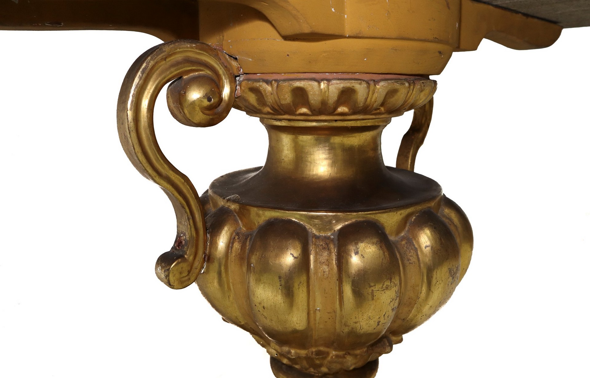 Tavolinetto assemblato con base a forma di vaso biansato in legno dorato a foglia e piano in marmo lastronato, XVIII secolo base, non-coeval top