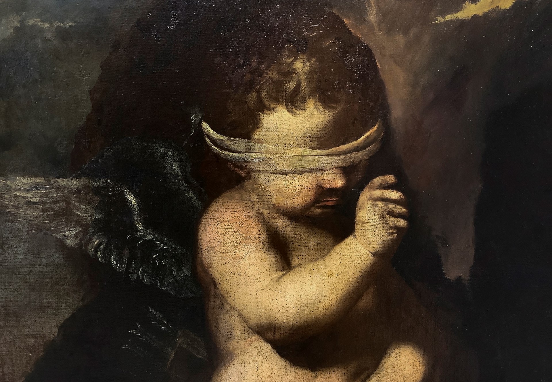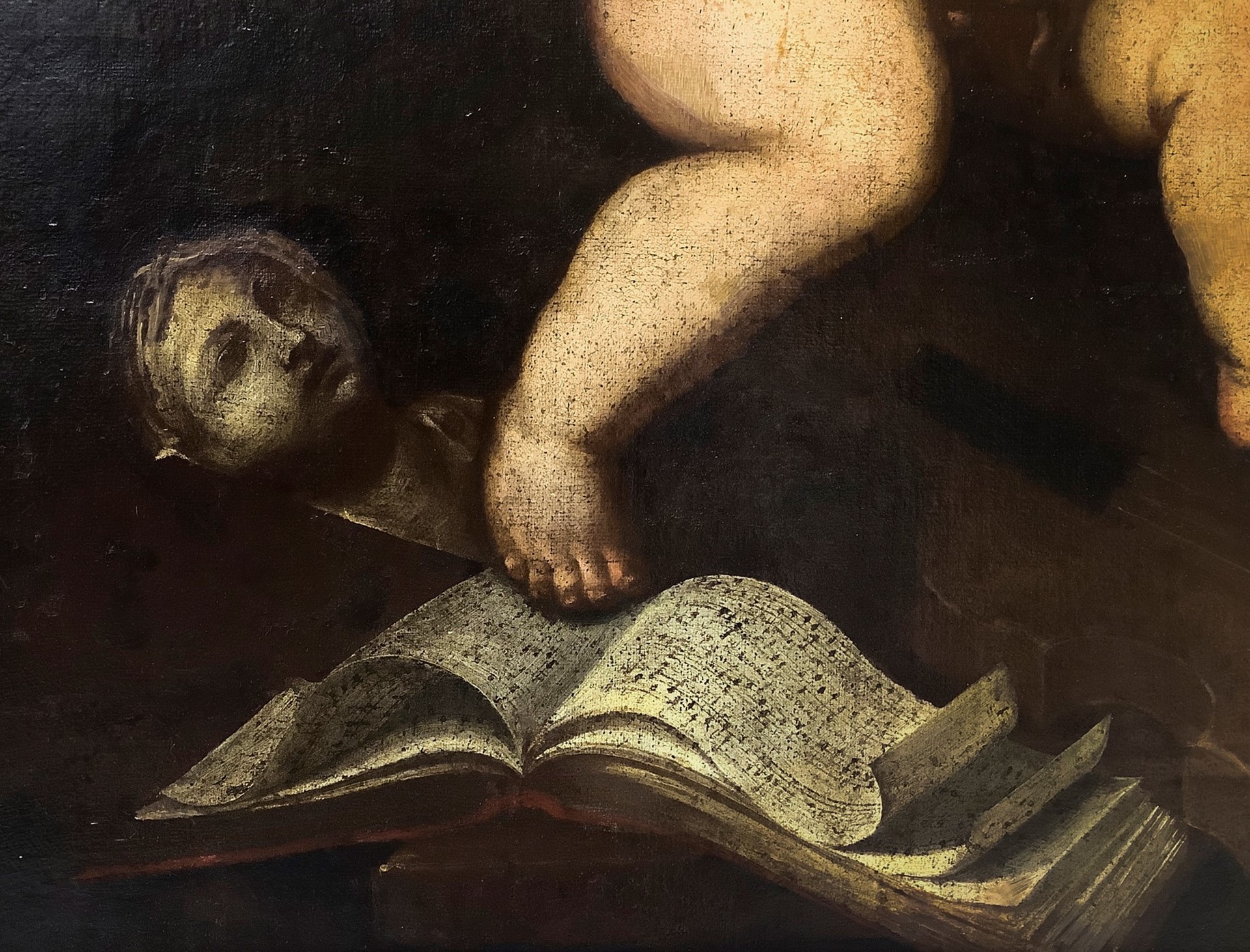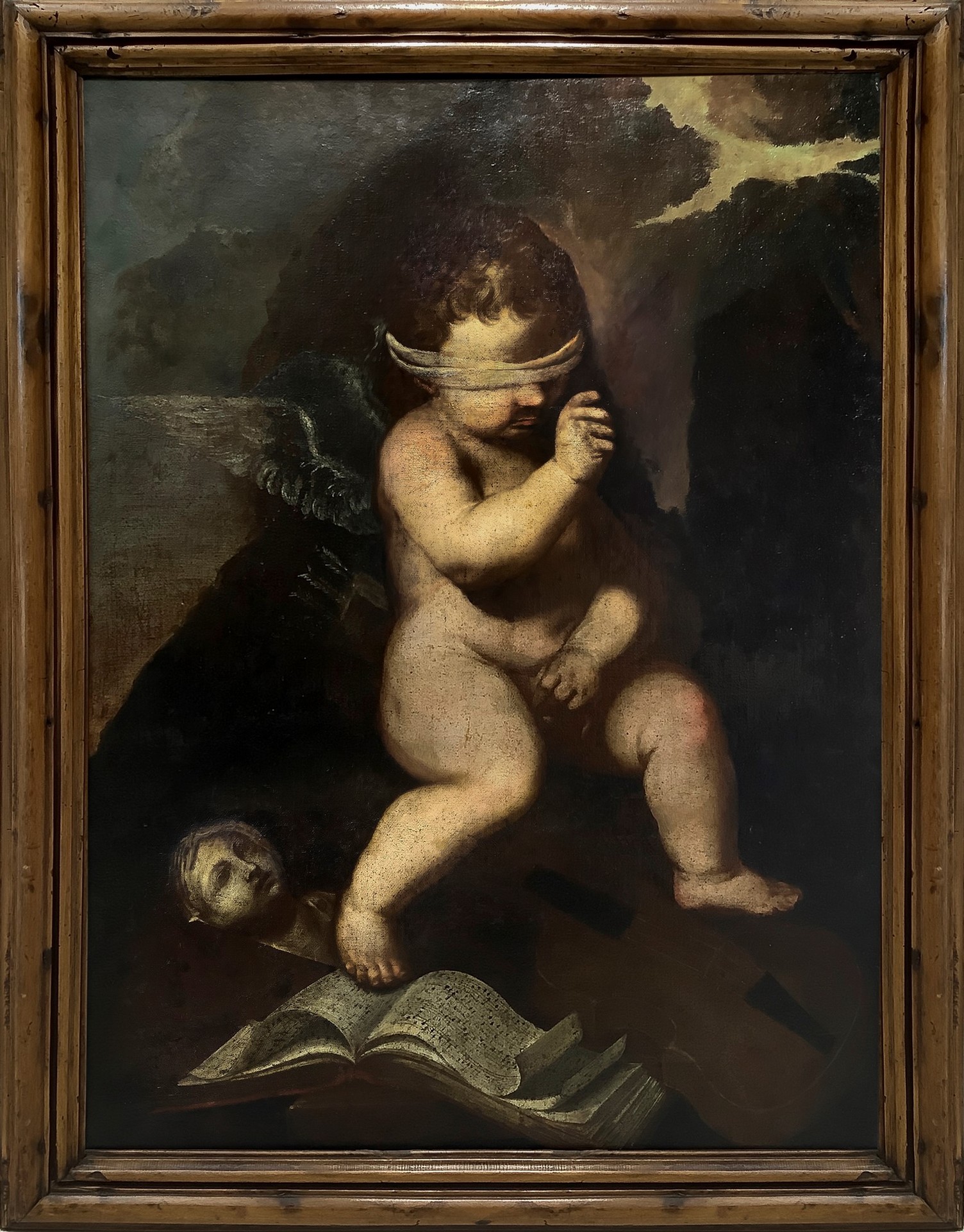Carlo Cignani (cerchia di) (Italian 1628-1719) - Allegoria della musica e della poesia, XVII/XVIII secolo Cm 95x72, Olio su tela Pittore bolognese del XVII/XVIII Secolo.La benda indica che le arti della musica e della poesia sono apprezzabili senza l'aiuto della vista.