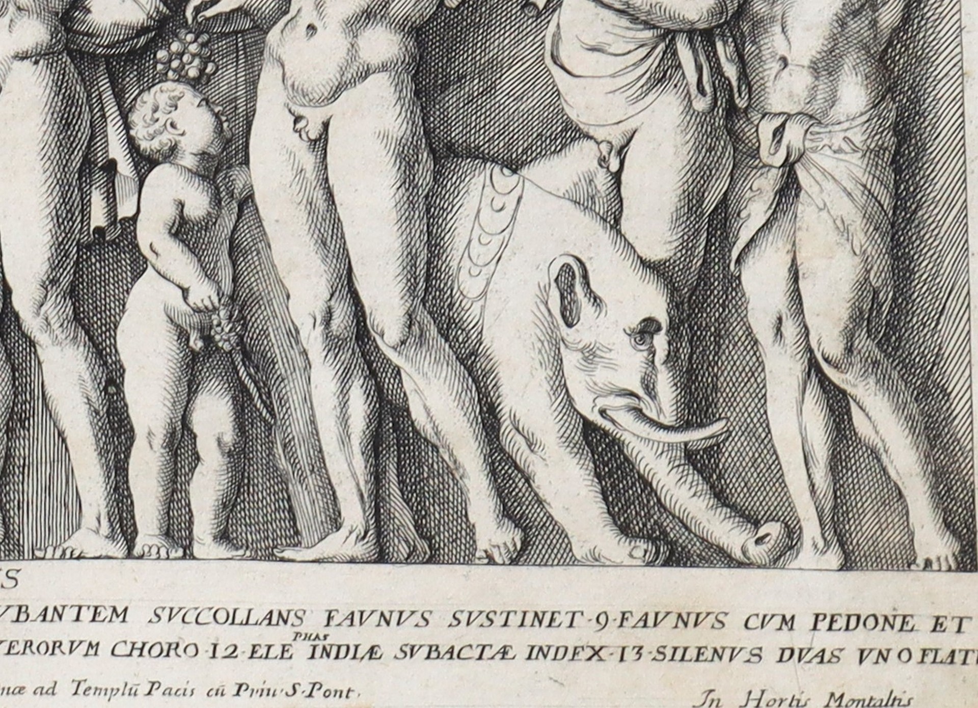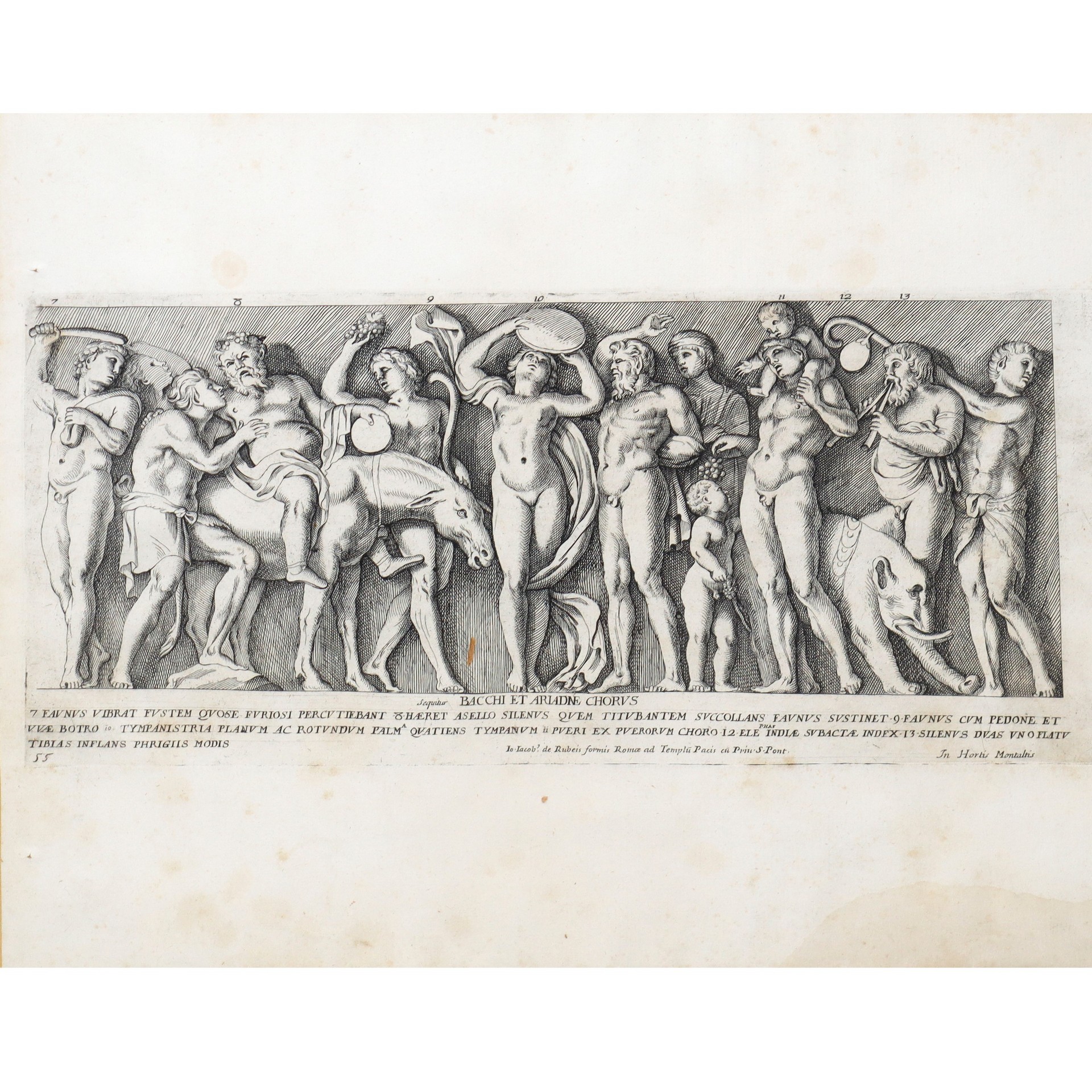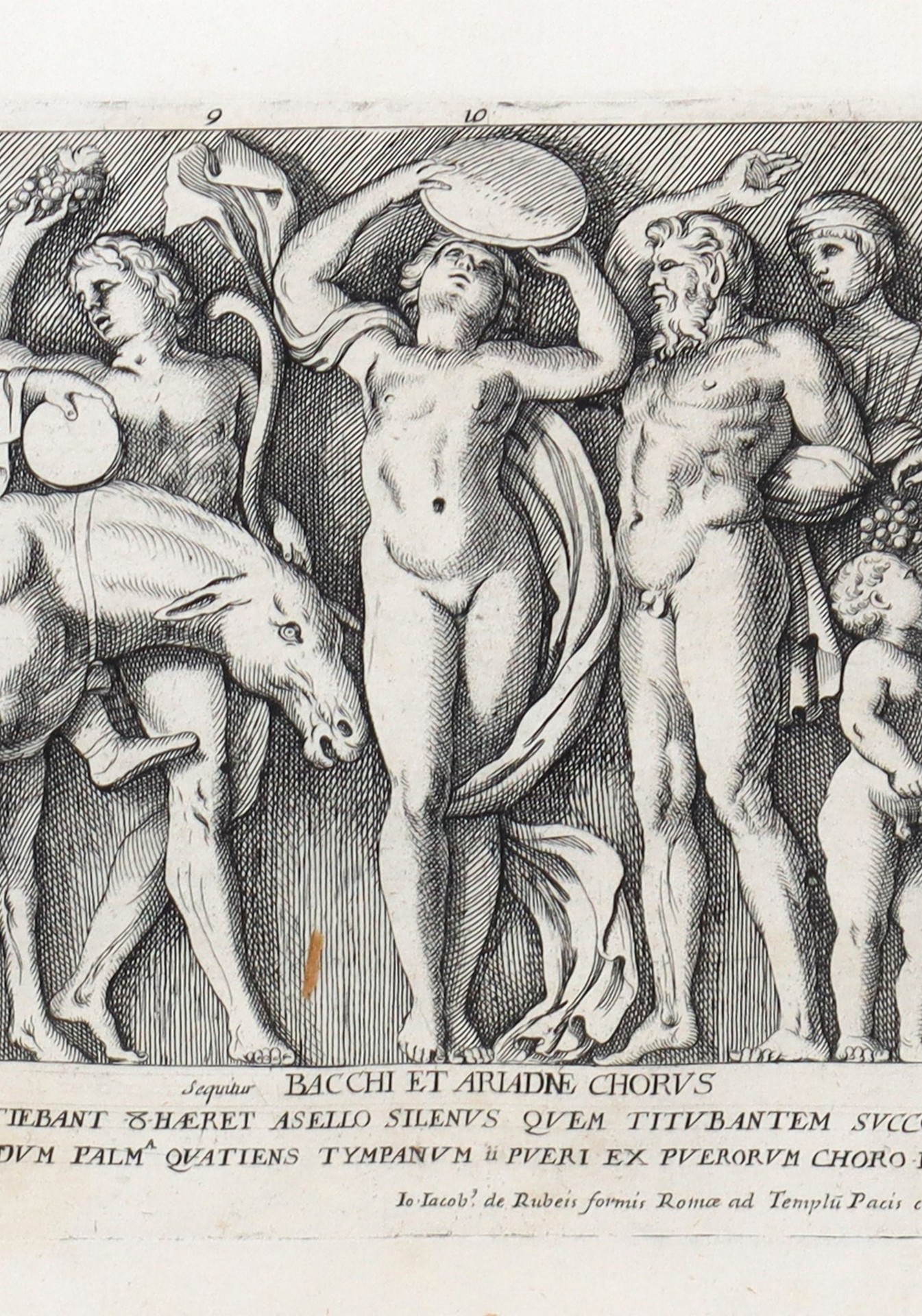 Bacco e Arianna, 1600 Incisione su carta vergellata Incisore Jacobus De Rubeis (1626-1691) raffigurante formella del tempio della pace in Roma