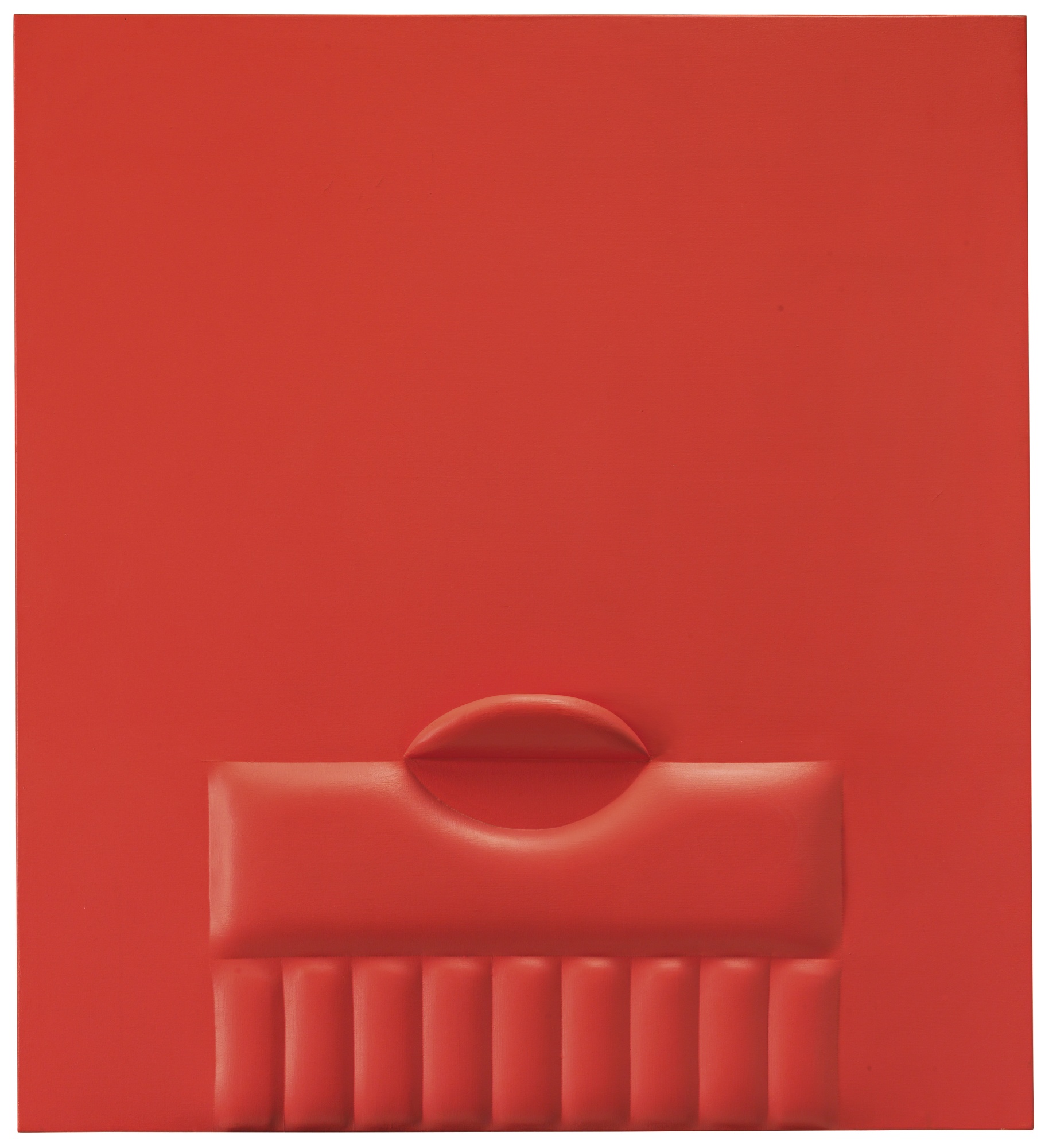 AGOSTINO BONALUMI 1935-2013 ROSSO signed and dated 65 on the reverse, shaped canvas on vynil tempera firmato e datato 65 sul retro tela estroflessa e tempera vinilica cm 110x100 Opera registrata presso l'Archivio Bonalumi, Milano, con il n. 65-072 L'opera è accompagnata da certiticato su fotografia rilasciato dall'Archivio Bonalumi, Milano PROVENANCE Galerie Thelen, Essen Johnssen Collection, Germania Ivi acquistato dall'attuale proprietario nel 1986