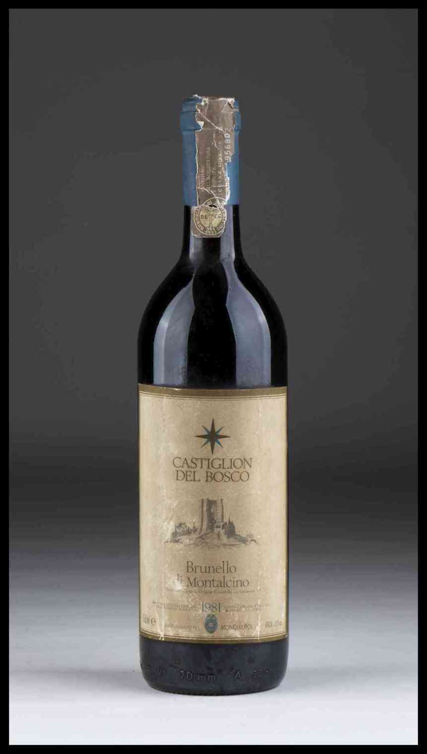 Castiglion del Bosco, Brunello di Montalcino Toscana, Brunello di Montalcino - 1 bottiglia (bt), annata 1981.Livello: sommità della spalla (TS), livello normale per i vini di oltre 15 anni d'età.Condition report: etichetta e capsula con lievi segni d'usura del tempo.Note: edizione speciale per Mondialpol.