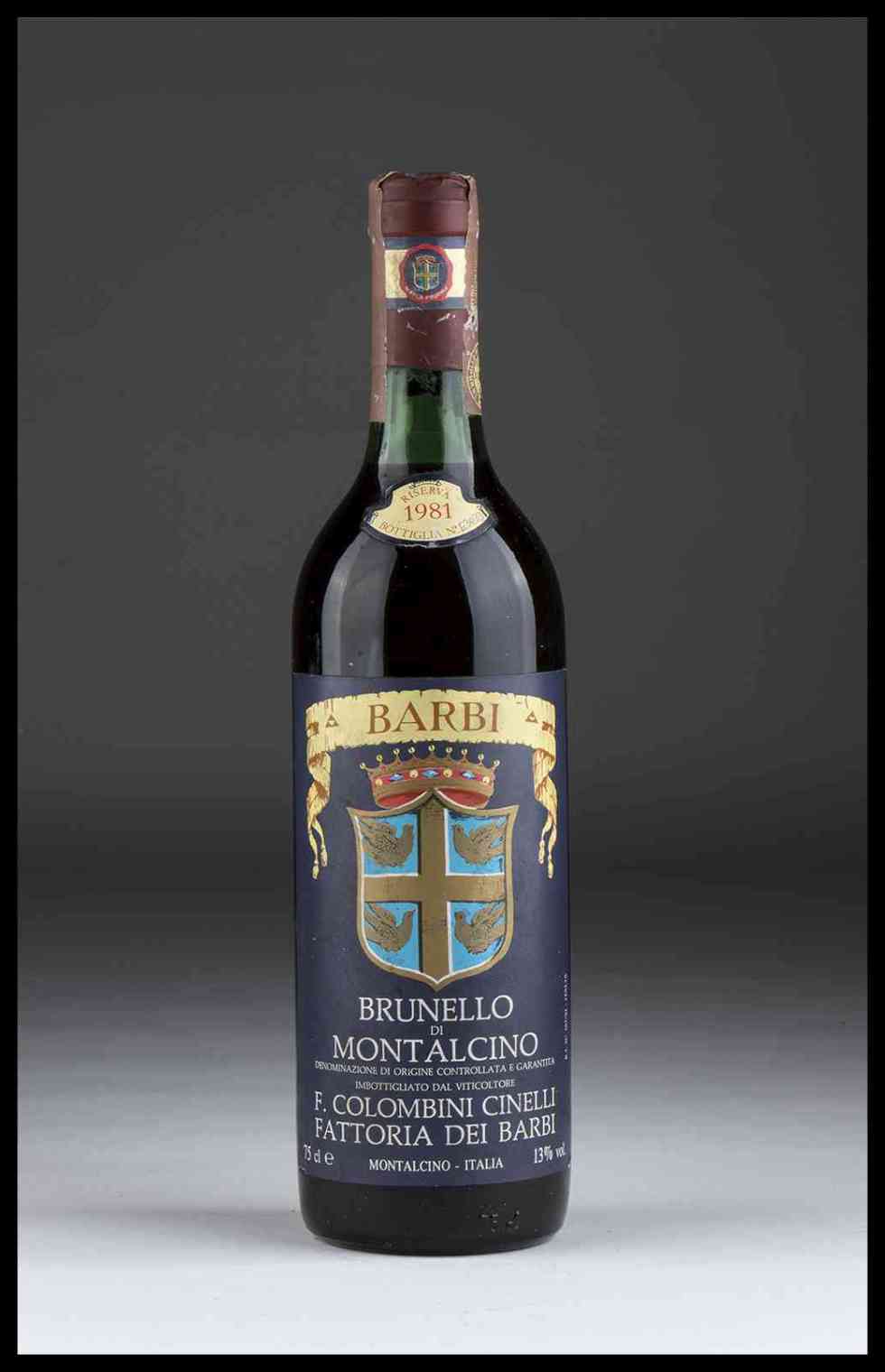 Fattoria Dei Barbi, Brunello Di Montalcino Toscana, Brunello di Montalcino DOCG -1 bottiglia (bt), annata 1981.Livello: sommità della spalla (TS), livello normale per vini oltre i 15 anni di età.Condtion report: etichetta in ottime condizioni e capsula con lievi segni d'usura del tempo.