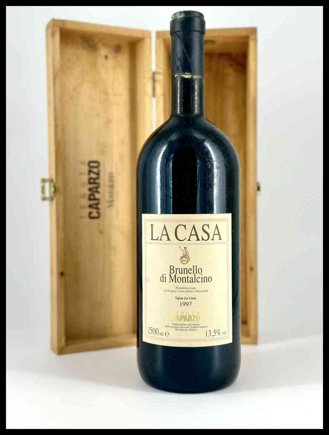 Tenuta Caparzo, Brunello di Montalcino La Casa Toscana, Brunello di Montalcino La Casa DOCG - 1 magnum (Mg), annata 1997.Livello: entro il collo (WN), livello di colmatura standard.Confezione: scatola di legno originale (OWC).Condition report: etichetta in buone condizioni, con segni d'usura del tempo.