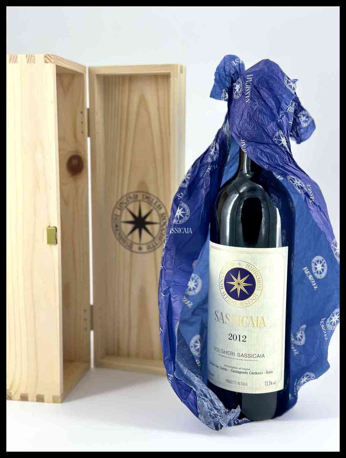 Tenuta San Guido Bolgheri, Sassicaia Toscana, Sassicaia DOC - 1 bottiglia (bt), annata 2012.Livello: entro il collo (WN), livello di colmatura standard.Confezione: scatola di legno originale (OWC).Condition report: etichetta e capsula in buone condizioni.