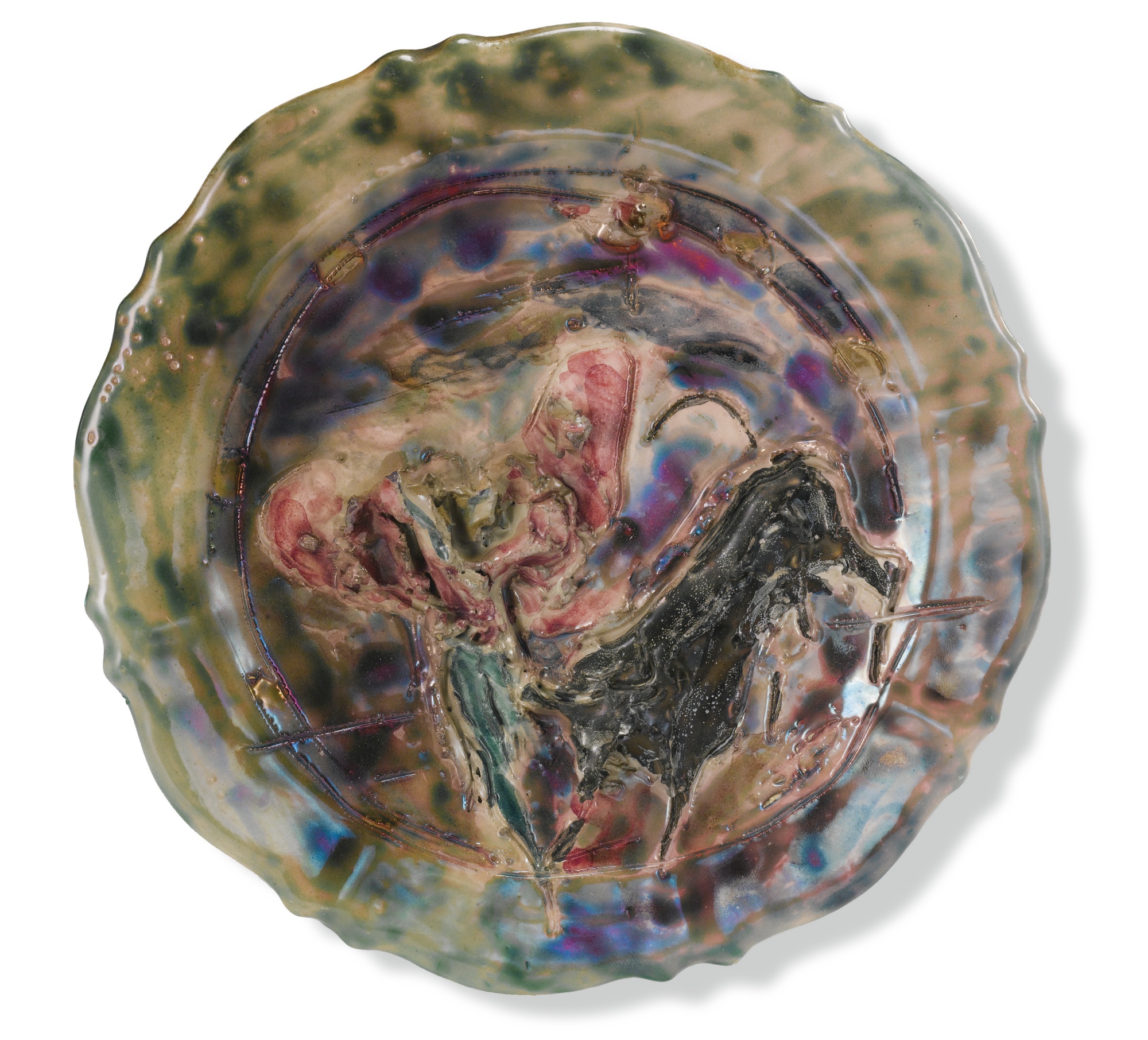 LUCIO FONTANA 1899 - 1968 TAUROMACHIA/CORRIDA signed and dated 50 on the reverse, glazed ceramic firmato e datato 50 sul retro piatto in ceramica diam. cm 25 Opera registrata presso la Fondazione Lucio Fontana, Milano con il n. 1265/18 L'opera è accompagnata da certificato su fotografia rilasciato dalla Fondazione Lucio Fontana, Milano PROVENANCE Grossetti Arte Contemporanea, Milano Decomania Antiquari, Milano Ivi acquistato dall'attuale proprietario agli inizi degli anni 2000 CATALOGUE NOTE L’opera è accompagnata da attestato di libera circolazione The lot is accompanied by an export licence