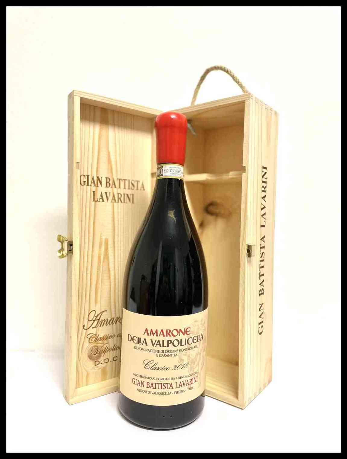 Lavarini Gian Battista, Amarone della Valpolicella Classico Veneto, Amarone della Valpolicella Classico DOCG - 1 magnum (Mg), annata 2018.Livello: entro il collo (WN), livello di colmatura standard.Confezione: scatola di legno originale (OWC).Condition report: etichetta e capsula in perfette condizioni.