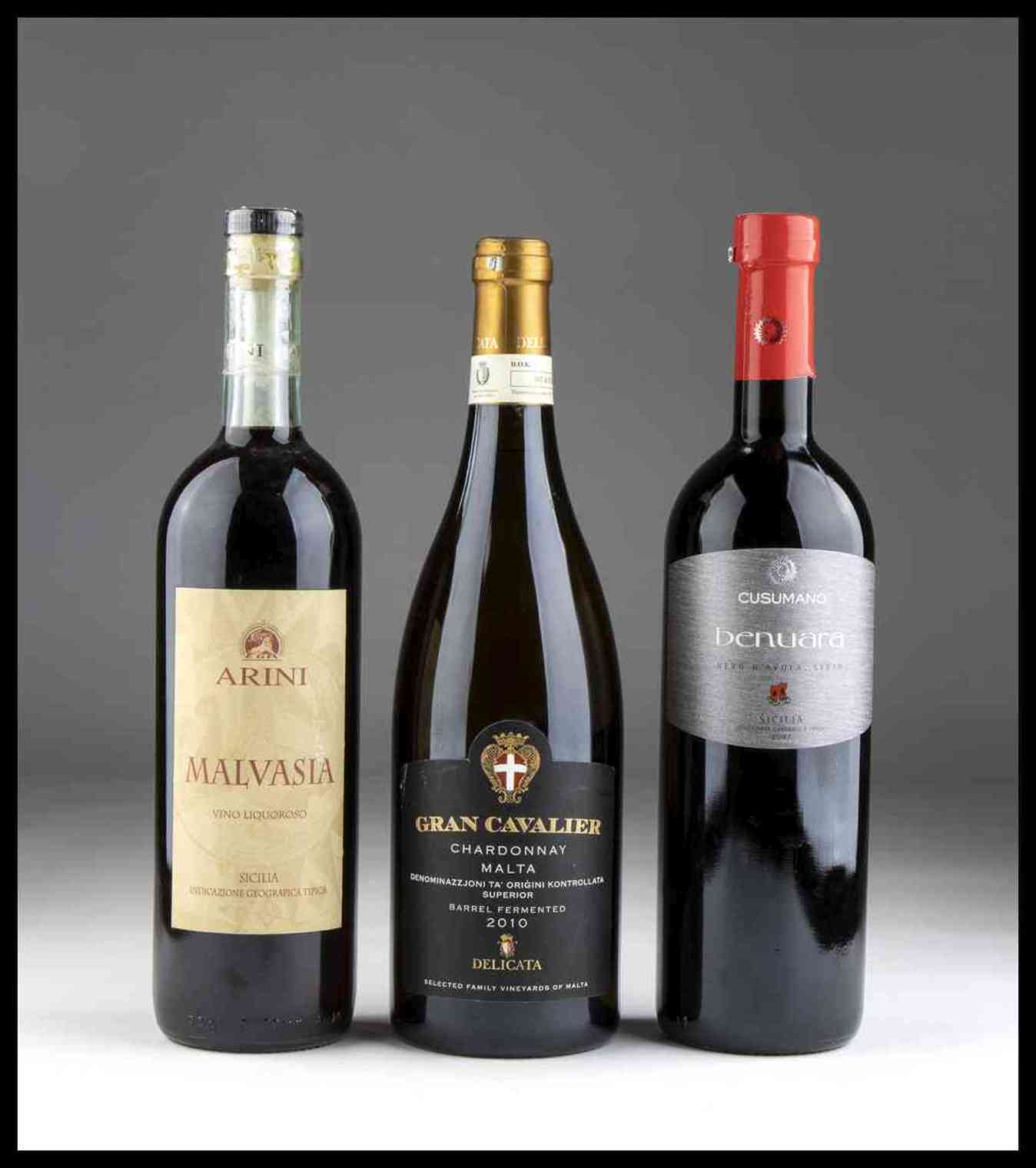 a. Sicilia, Arini Malvasia IGT, 1 bottiglia (bt), anni 2000.b. Sicilia, Cusumano Benuara Nero d’Avola e Syrah IGT, 1 bottiglia (bt), annata 2007.c. Malta, Emmanuel Delicata Gran Cavalier Chardonnay Dok Superior, 1 bottiglia (bt), annata 2010.Livello (per tutte le bottiglie): entro il collo (WN), livello di colmatura standard.Condition report (per tutte le bottiglie): etichetta e capsula in perfette condizioni.