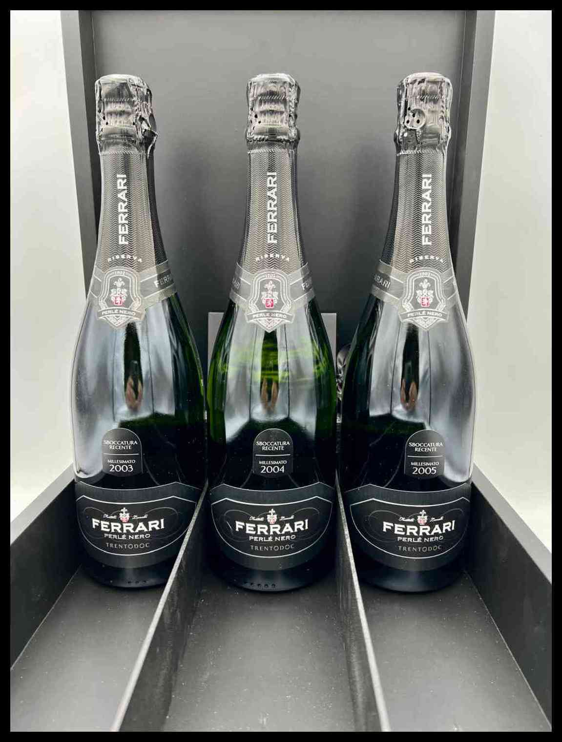 Fratelli Lunelli, Ferrari Perlé Nero Riserva, Millesimato Trento Doc Trentino Alto Adige, Ferrari Perè Nero Sboccatura Recente Millesimato, 3 bottiglie (bt), annata verticale 2003-2004-2005.Confezione: scatola di legno originale (OWC).Livello: entro il collo (WN), livello di colmatura standard.Condition report: etichetta e capsula in perfette condizioni.certificazione allegata della Famiglia Lunelli.