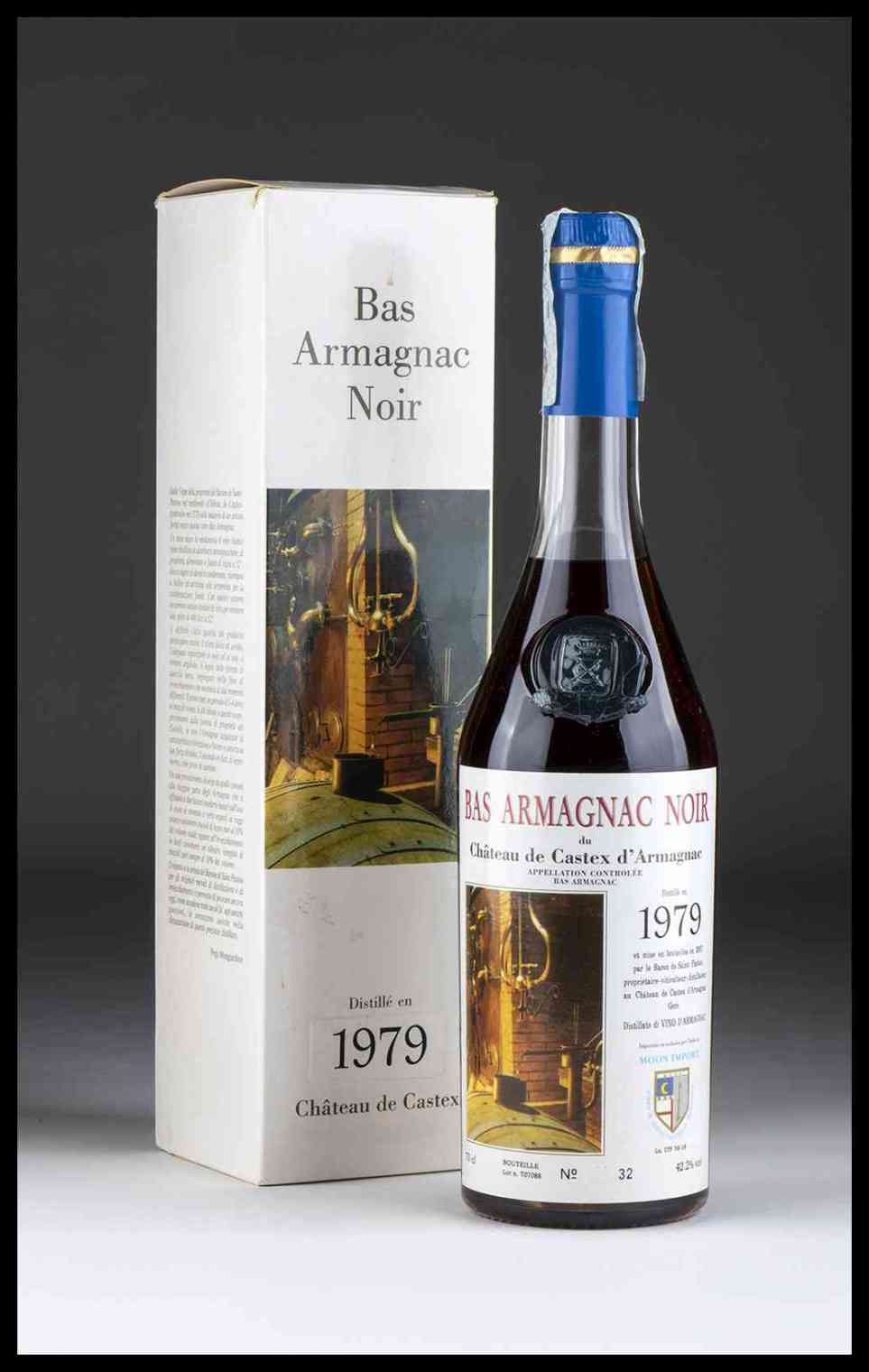 Château de Castex d'Armagnac, Bas Armagnac Noir 1979 Francia, Bas Armagnac - annata 1979.70 cl - 42,2% vol.Livello: spalla (S), livello normale per i distillati fra i 10 e i 15 anni d'età.Confezione: cartone originale (OC) in buone condizioni.Condition report: etichetta e capsula in perfette condizioni.