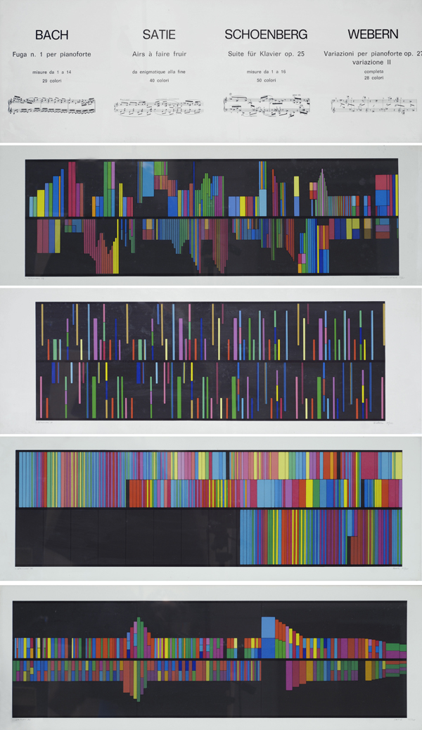 Luigi Veronesi (Milano, 1908 - 1998) BACH, SATIE, SCHENBERG, WEBERN, 1979 Serigrafia, mm. 350x1000 (ciascuna); es. 15/125 Un frontespizio e quattro opere firmate e datate in basso a sinistra, tiratura in basso a destra; timbro a secco Are Studio in basso a destra.