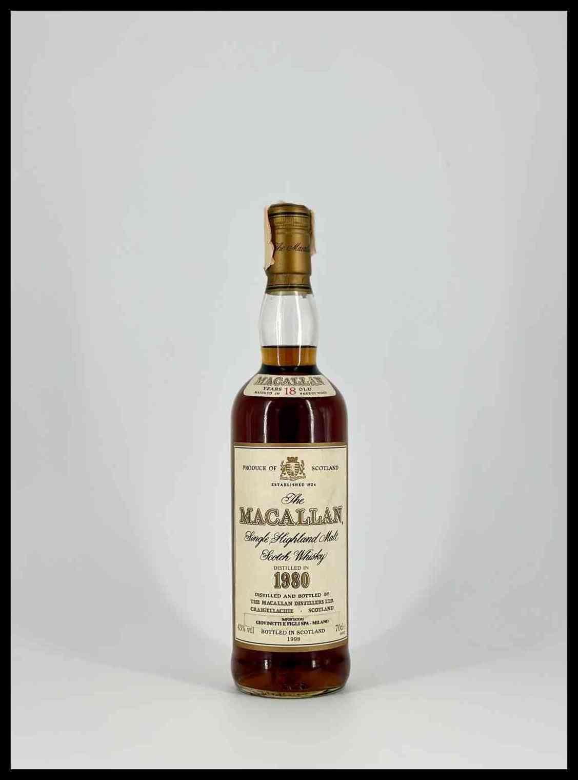 The Macallan Single Highland Malt 1980 18 Years Old Scotch Whisky Scozia, Old Single Malt Scotch Whisky. 70 cl - 40% vol. Livello: sommità della spalla (TS), livello normale per i vini di oltre 15 anni d'età. Condition report: etichetta e capsula in buone condizioni.