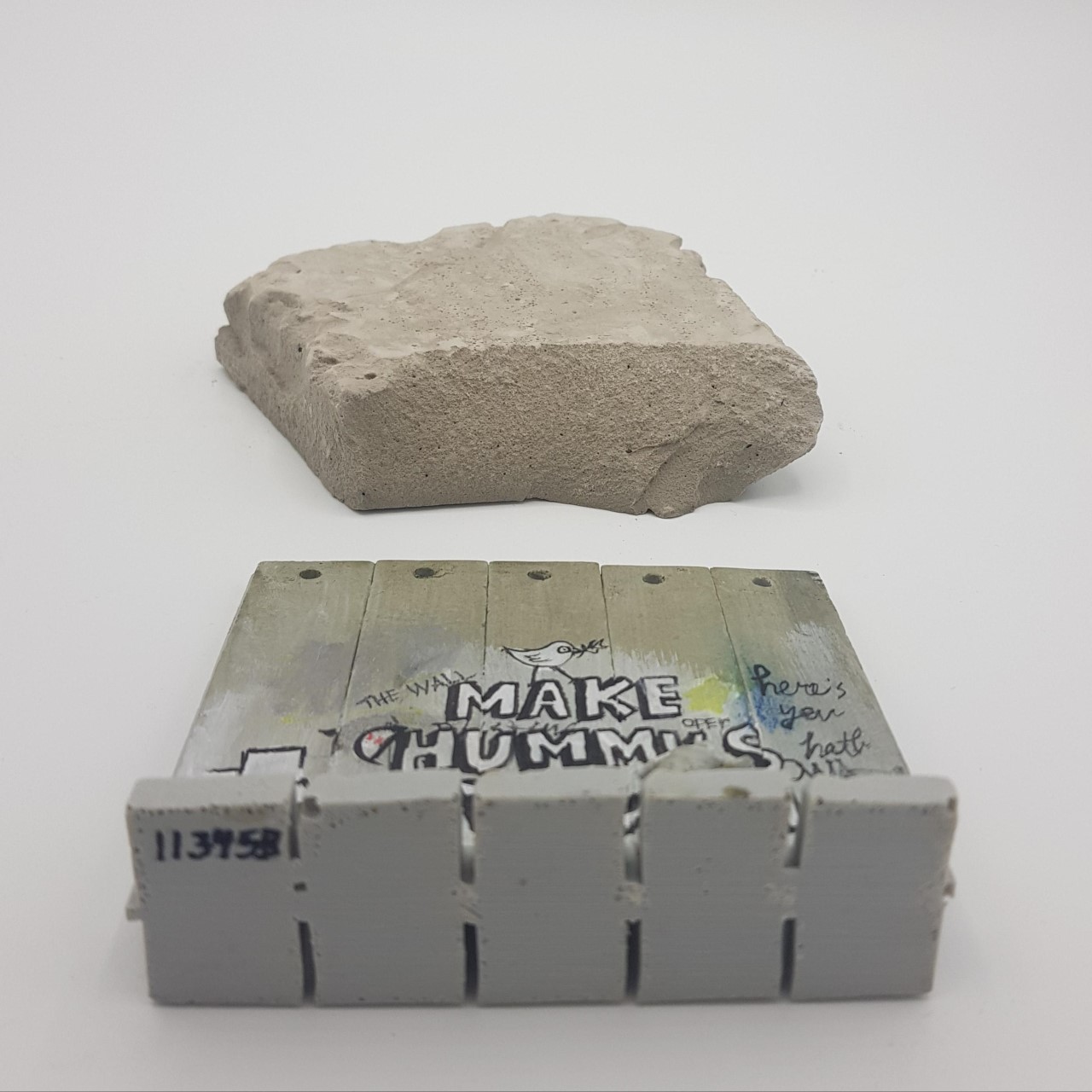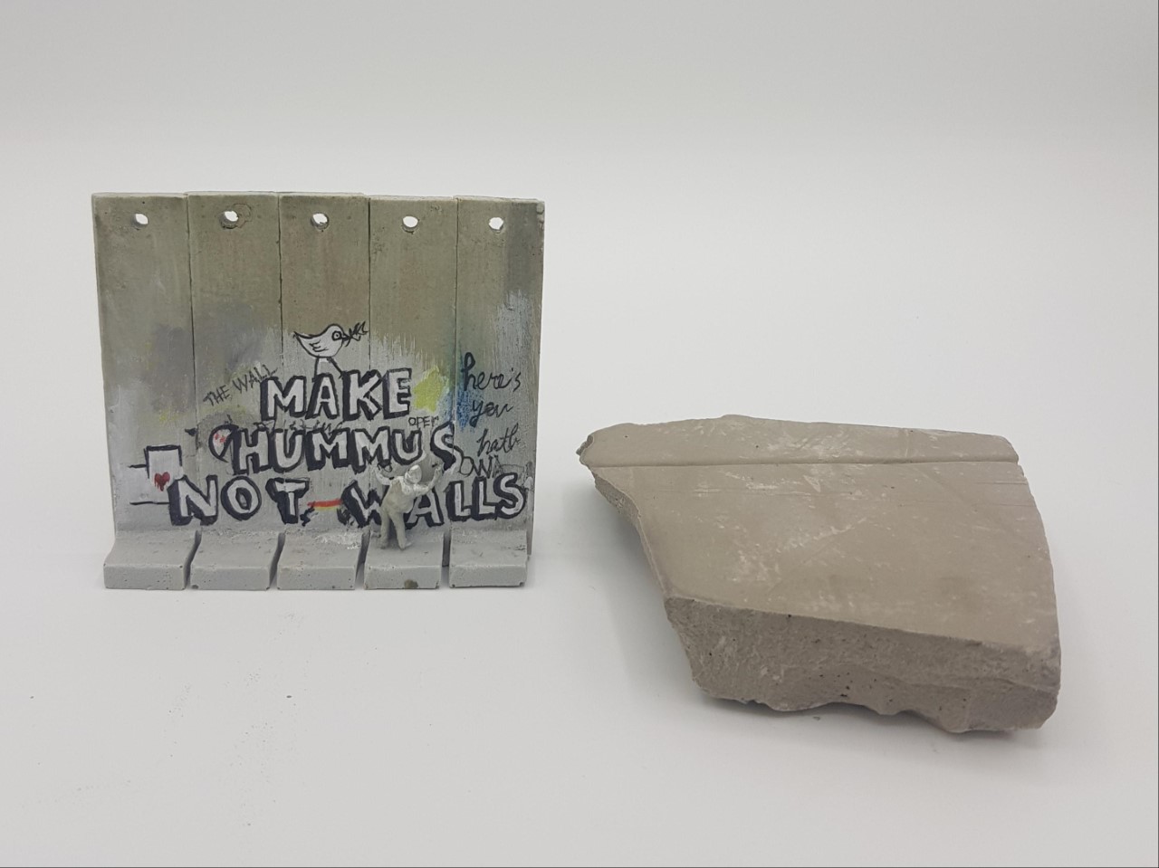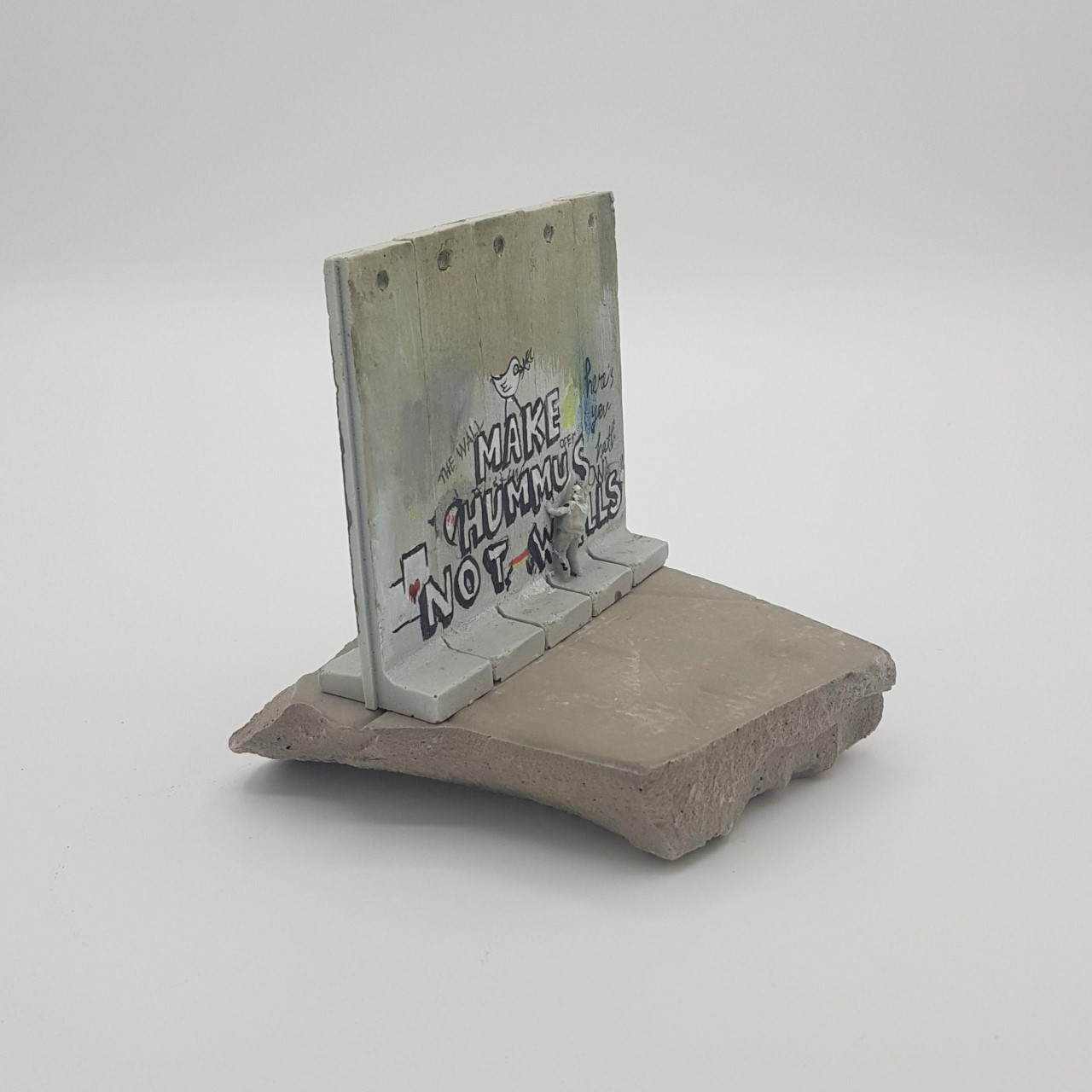 La base è composta da un pezzo del muro di separazione Israele/Palestina. Numero di serie scritto a mano sotto la base. Certificato di autenticità del Walled Off Hotel di Betlemme.