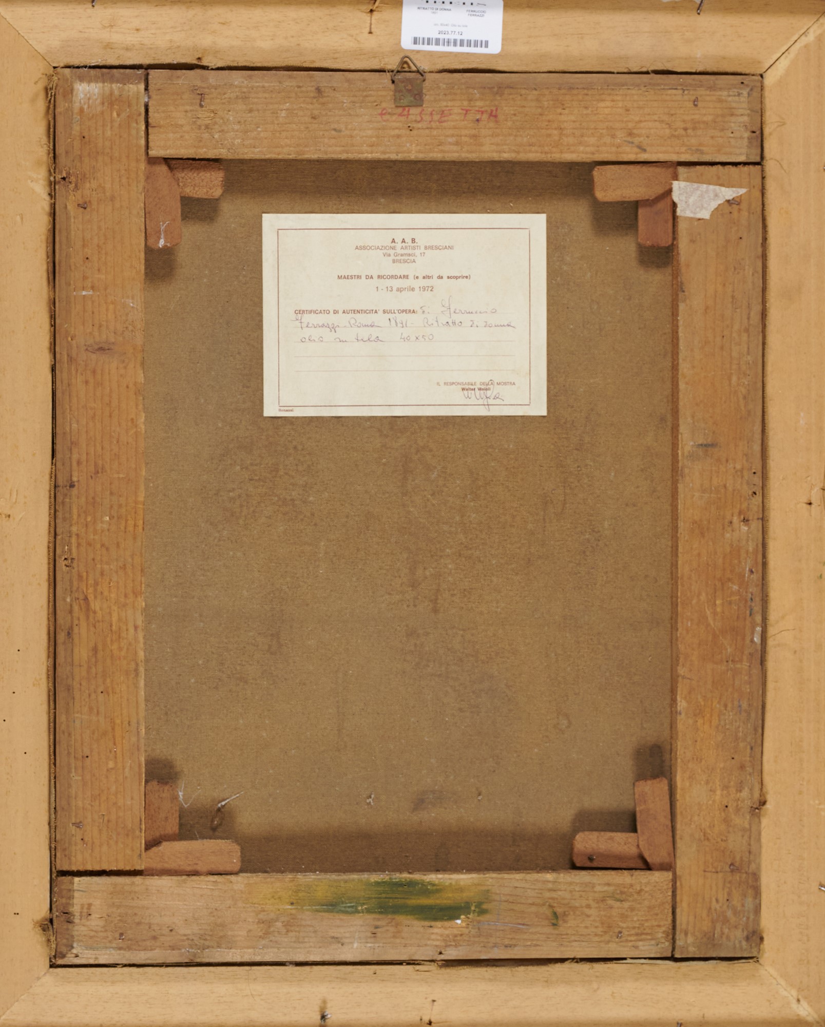 Sul verso: etichetta "Associazione Artisti bresciani - Artisti da ricordare (e altri da scoprire)" 1 - 13 aprile 1972, con scritto di autenticità e descrizione.