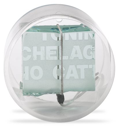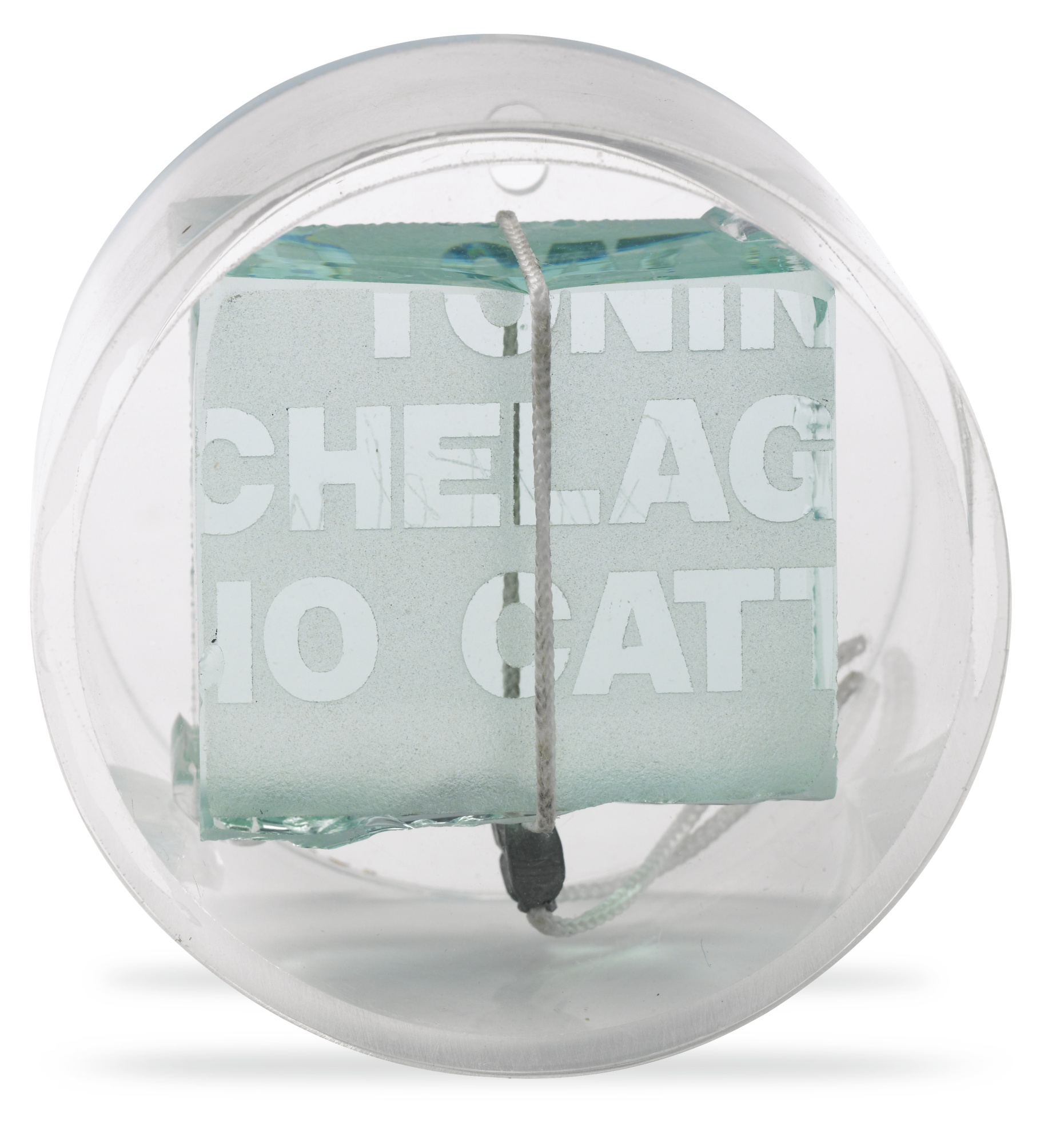 MAURIZIO CATTELAN N. 1960 FRAMMENTO signed, etched glass, lead seal and string. Executed in 1992 firmato vetro, corda e sigillo in piombo cm 5,5x5,3x1,9 Eseguito nel 1992
