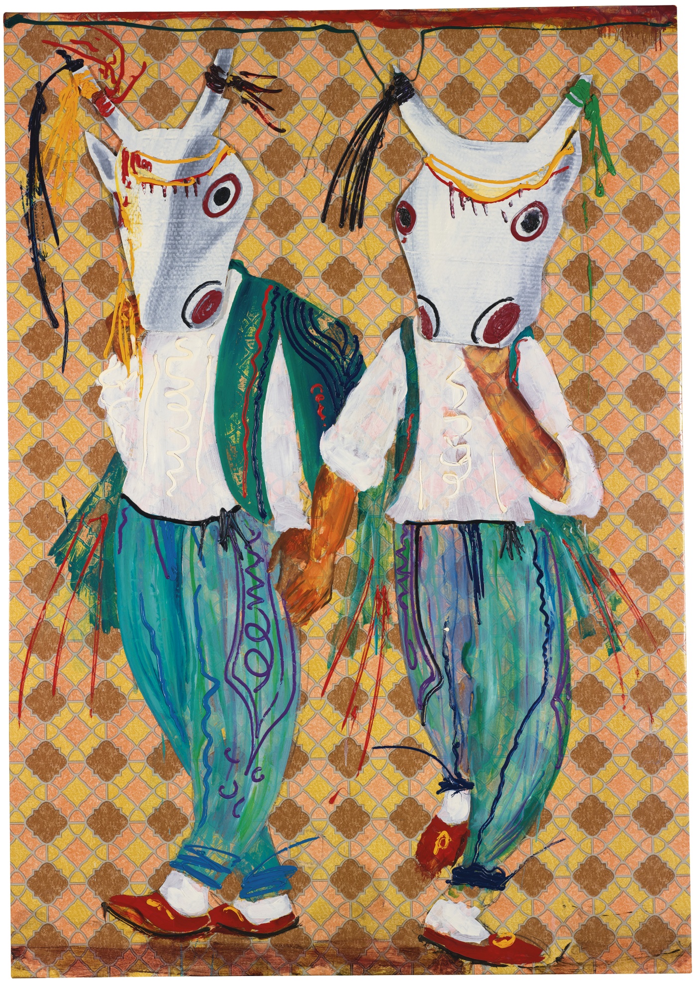ALDO MONDINO 1938-2005 MASCHERE BALLETTO TURCO signed on the reverse, oil on linoleum. Executed in 1989 firmato sul retro olio su linoleum cm 200x140 Eseguito nel 1989 Opera registrata presso l'Archivio Aldo Mondino, Milano PROVENANCE Fondazione Mudima, Milano Ivi acquistato dall'attuale proprietario nel 1990