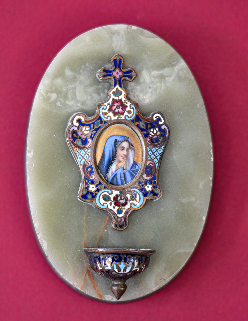 Acquasantiera in onice e smalti policromi, con placca dorata e smaltata raffigurante la Madonna (Francia)